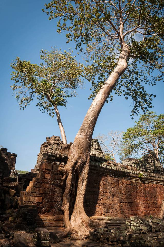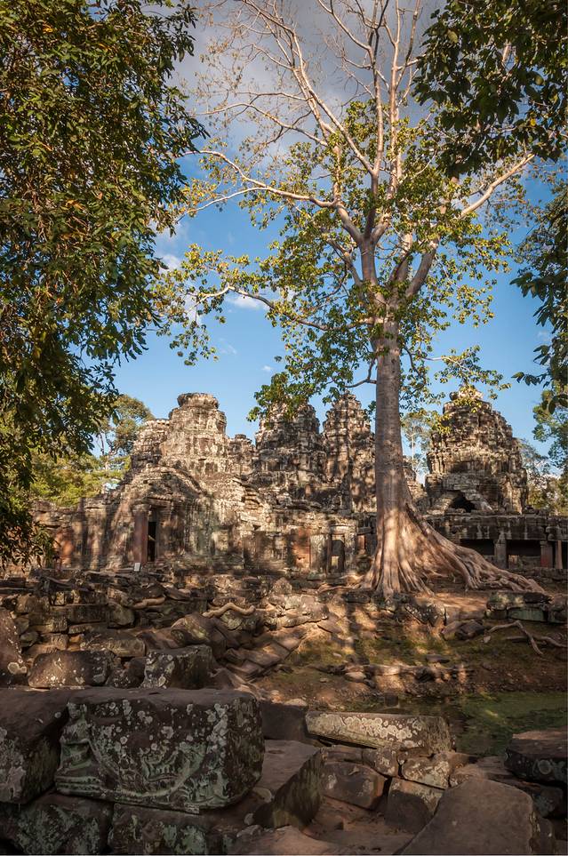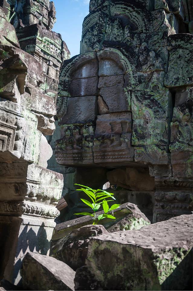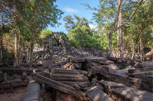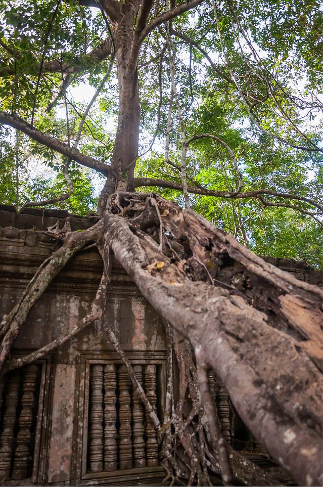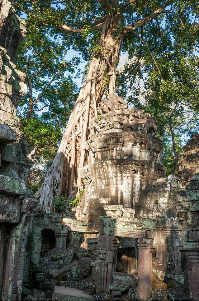 从高布斯宾到崩密列的一个半小时果然很自虐。腿麻了,屁股颠烂了,白色T恤上粘了一层土,掸下来够养一盆花了……强烈建议各位吸取教训,不是万不得已不要走这条捷径。崩密列的门票5刀是单独收的,不包含在大景区门票内。崩密列是一个未被修复的寺庙,所以看到的大多是倒塌的建筑,各种乱石堆砌,以及石缝中墙壁上的树根藤蔓。跟塔布笼寺的树石相生比起来,这里更像是已经完全被古树征服,在坍塌的废墟上往往是一棵古树拔地而起,围墙上也都是爬满了藤蔓。