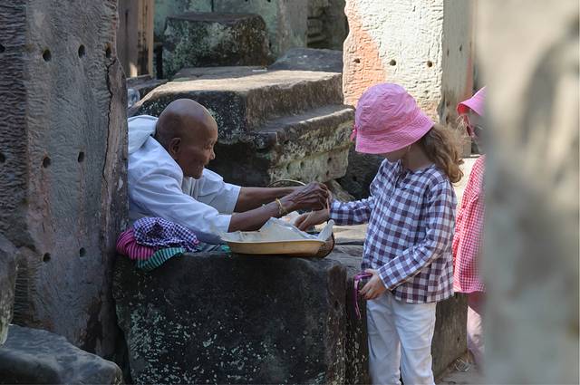 我来的时候带了一些糖果和文具准备给这些孩子。第一次发给孩子们的时候,他们没有我想象中那么高兴,有点习以为常的感觉,有的虽然得到了糖果和文具,仍然坚持要我买他的明信片或纪念品。在有的寺庙还有小孩主动帮忙导游,然后索要小费。这些孩子为了讲解景点或是劝客人买东西,往往会学很多种语言,不怎么标准的英语汉语日语轮着试,“先生,一块两个,给人民币也可以”。如果你怎么都不肯买,他们还有杀手锏,对男的是“不买不帅!”,对女的是“姐姐你丑!”。第二天早餐时跟一个英国大妈聊天,她是第一天到,正准备去参观景区,我还好心提示她有人主动导游然后索要小费,可以开始的时候就拒绝,英国大妈说“但他们也要生活啊”。结合月亮先生讲的背景想想也有道理。开始我一直在想这些孩子为什么不上学,没有钱上不起还是家长觉得上学没用。月亮先生告诉我其实他们是上学的,只是这里的学校一天只上四小时,其余的时间他们就会到景区卖点东西赚钱。即使这些钱最后是被他们的父母收走了,但最终这些钱还是会花在抚养这些孩子上。按照当地人的收入水平,抚养这么多孩子实在不是件容易的事。所以我觉得在能力允许的范围内适当地买他们一点东西,帮帮他们也是应该的。有一次在斑蒂喀黛遇到五个小女孩围着我要我买东西,我犹豫了一会最后决定每人买一美元的东西,由于当时身上只有10美元的钞票,需要他们找零,结果五个人凑了一下只拼出三美元。原来他们一下午的收成也就这么多而已。我提出出去买瓶水把钱破开,她们怎么都不肯,就怕我不会回来了。一个小女孩赶忙跑去跟别人借钱,最后跑回来也只是借到一美元。实在不忍心看到她们的兴奋变成失望,最后又多买了一件了事。