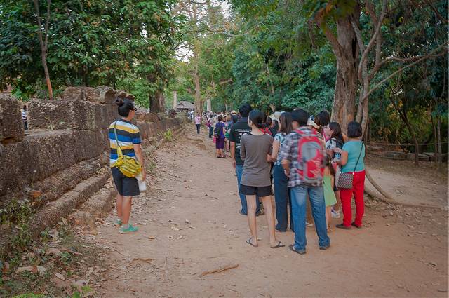 在暹粒,要么种水稻,要么跟游客打交道。我问月亮先生他的高中同学现在都在做什么,答案有点出乎我的意料——宾馆服务生,嘟嘟车司机,摩托车司机,没别的了。原来这里除了农业就是旅游业了,没有工厂,没有公司,要么种地,要么赚游客的钱。这样看来,除了英文,高中所学完全没有用武之地。种地是个苦差事,又累又没钱赚,而且还要看老天的脸色。2011年柬埔寨闹洪灾,月亮先生家虽然没有水稻田,但是家里的几棵芒果树全都死掉了。重新种上树苗,等到结果要五六年的时间。做嘟嘟车或摩托车司机要相对轻松一点,但是也有很多苦衷。比如他去机场拉客人是有严格规定的,只要拉走一个客人,三天不准再进机场,因为假定这个客人会雇你三天。如果倒霉拉到一个来工作的或者只玩一天的,那后面就要失业两天没钱赚。即使这样,每年还要给机场上供500美金。而且机场还有各种条目,比如衬衣没有塞到裤子里——n天不准进机场。平时还要防着警察,因为有时警察会找各种借口扣车勒索。加上柬埔寨的油费飙高,摩托车司机的成本也跟着飞涨,生意很难做。而且每年只有12月到3月是旺季,能多赚一点,其他月份生意要差很多。我问他一个月平均能赚多少,他说大概两三百美元,这些钱他要付油钱,应付日常开销,还要供养母亲。能赚这么多还是因为车是他自己的,如果没有车就只能帮别人开,像月亮先生的弟弟,帮别人开车一个月只能赚60美金。不过对于月亮先生来说,现在的收入维持生活是没有问题的。旅游业在暹粒的兴起其实没有几年,但旅游业俨然已经成为当地人赖以生存的产业。Jayavarman七世国王或许没有想到,他所建造的寺庙所祭拜的神灵最后没能帮他抵御外族的入侵,却在几个世纪后为他的子民提供了生存之路。