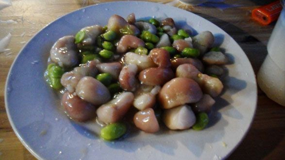 傍晚了,天色渐渐暗了下来,该找个地方填饱肚子啦。雨停了,我们选了个临近河畔的位置,悠然自得。这个菱角炒毛豆很好吃,米酒我还是喝不习惯,还是王老吉好,好喝又去火。椒盐南瓜也不错,8过吃的太欢,忘记拍照片了。