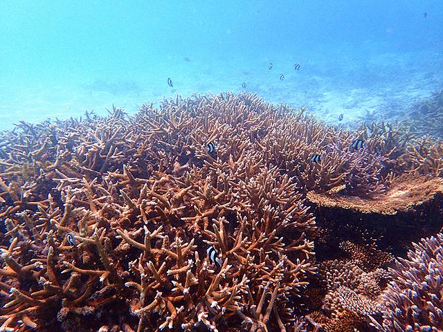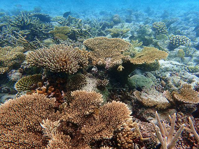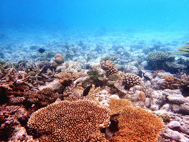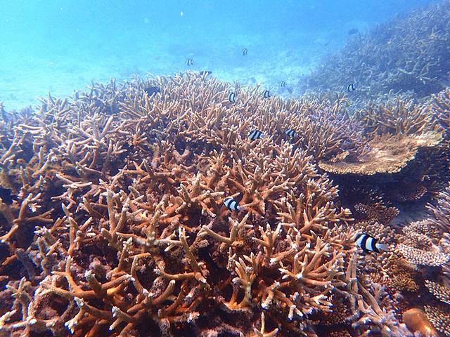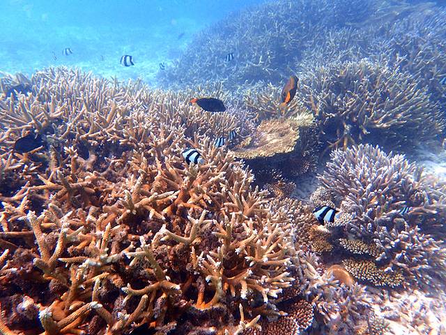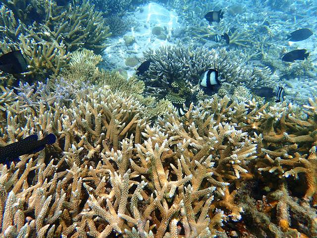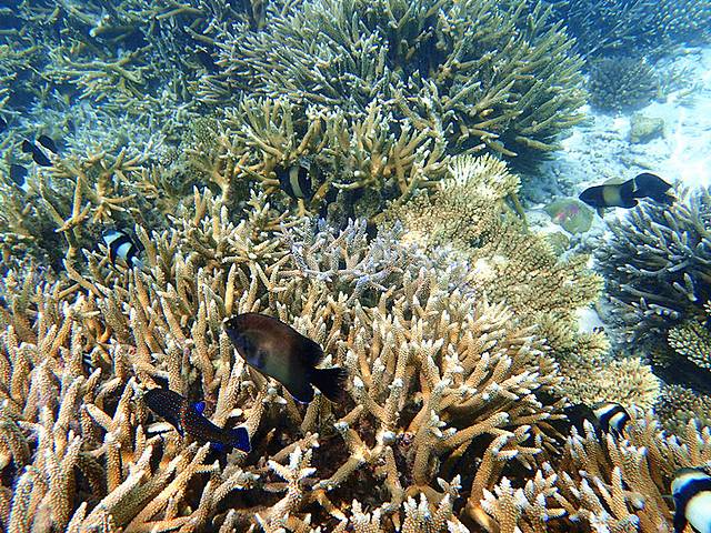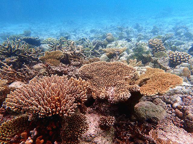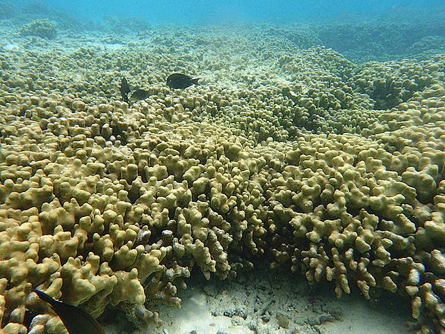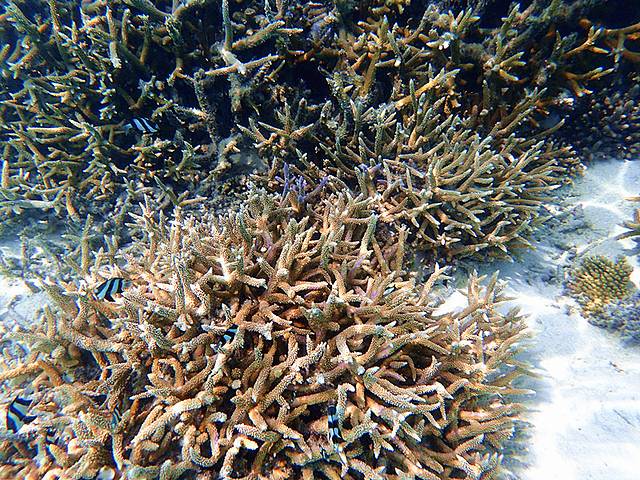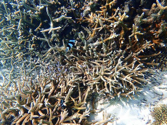 海龟岛的浮潜一直不被看好,查过各种资料有说他们家浮潜C级,也有说B级的,但经过实际的浮潜对比,其实AV岛的浮潜虽算不上A但也不算很差。主岛这边的浮潜区域主要集中在岛的东南面,这边水非常浅,退潮的时候水深才到膝盖,但是这边珊瑚全都是死珊瑚,没什么好看的,刚开始没下水的时候看水下一片片黑黑的我以为这边浮潜环境很好,下去之后才发现,实际是这样的,失望而归
