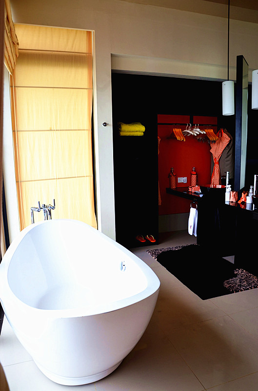 这就是水屋的内部设施了,这边是洗漱区,窗口的大浴缸,面朝大海,洗漱用品与沙屋差不多,挂衣服的架子稍微多点