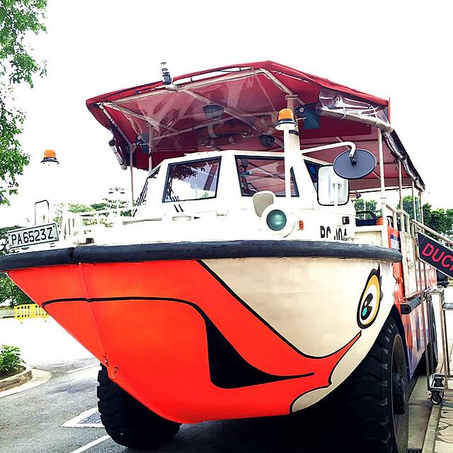 说到观光巴士,这里说一下新加坡很火的鸭子船,也就是水陆两用观光船,陆地和水里都能开,买票乘坐地点和橙色巴士在同一个地方,貌似国内淘宝上还有很多代理在代卖鸭子船的船票,船上带讲解,这个有兴趣的可以了解下,主要特色其实就是一个交通工具涵盖了巴士和船一起,可以开到鱼尾狮正面,其他卤煮觉得一般般,票价有点小贵,买通票也可以坐观光巴士和船啊,所以卤煮没有去坐鸭子船
