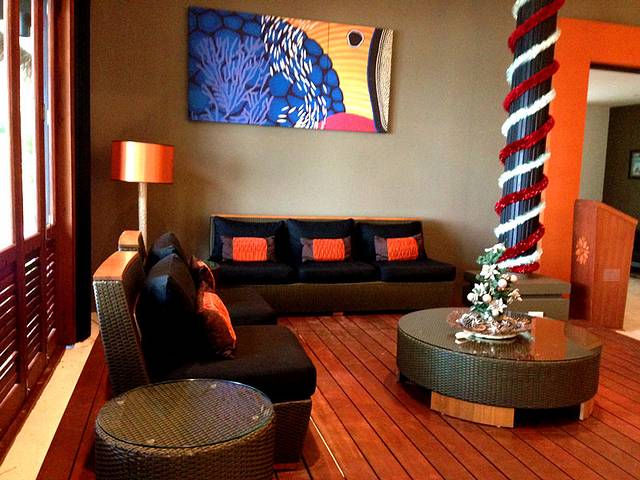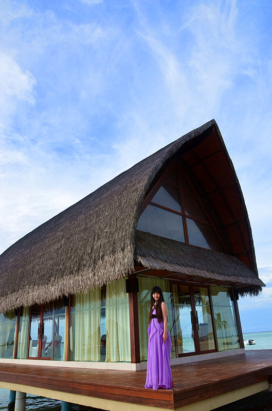 关于他们家水屋房间的设施,301-323房间是不带瑜伽亭的,341-351是带瑜伽亭的房间,361-363就是超豪水了,对于瑜伽亭这个设施也是不同人不同看法,有人觉得纯粹浪费,有人却超级中意,如果想入驻带瑜伽亭的一定要预定的时候跟岛上邮件说明清楚,另外水屋房间是上岛后安排的,不像沙屋是安排好的,所以可以跟管家搞好关系让他们帮忙安排下喽。至于是否安排的到就看你当天入住情况了。很负责人告诉你们带不带瑜伽亭与价格没任何关系,预定别听代理瞎吹加多少钱可以入住豪水一类的,当时我预定的时候有一个代理就这么瞎鼓吹,幸好姐姐我机智。住我们边上347房间的北京夫妻就是订的促销产品,按理是最差房间给他们才是,结果还是带瑜伽亭的日落水,所以真的是拼人品滴。我这么说做代理的看到肯定想打我吧,不过我是为大家负责,哈哈~