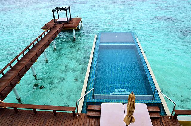 之前很多游记有说离码头最近的两幢(312和316)最好不要选,理由是很多船只和人员来往,但是其实吧~码头离水屋还有段距离的,根本看不大到水屋情况,再说了,大家都忙着度假谁乐意看你屋里发生什么,所以,纯粹是有些夸大其词了,安排房间这种事情完全是靠运气的,能分到靠里面点的是最好了,要是正好分到靠近码头的亲也别沮丧了,其实没那么夸张的,而且离码头近有一个好处是餐厅前台一直到码头那块区域下面全是珊瑚礁,邮过去才三四十米,很近。说到最好的珊瑚区,还有一块就是日落沙屋那一侧,出去没多远就是海沟,所以边上珊瑚很多,但是入住的时候管家会提醒你水性不好不要去海沟边上,因为这边可不像蓝色美人蕉岛有水下绳索的,所以注意安全,水性不好别去海沟边上,所以这么看来其实最安全但是珊瑚最好的地方其实是在餐厅前台那篇码头,所以分到靠近码头房间的亲不要沮丧啦,各有各的好处的,卤煮当时就羡慕他们在码头浮潜,因为卤煮房间是345,离码头超远,人也懒,所以就在自家水屋边上扑腾了一下