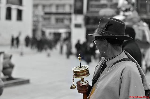 其实我也不太忍心用镜头打扰他们,他们都是顺时针绕着大昭寺一圈又一圈的走,一圈又一圈的磕长头,有些藏民连额头都给磕破或者磕起茧了,带着小孩一起在磕。中间会有藏民手里攥着一叠5毛或1块的纸币,遇见这些都会给张他们,可能也是一种善心吧。我遇到个老者,她只坐在那里转经桶,没有刻意的向行人要钱,就放了张5块在她的钱罐子里,她用藏语对我说了谢谢啥的吧,我也听不懂!!!