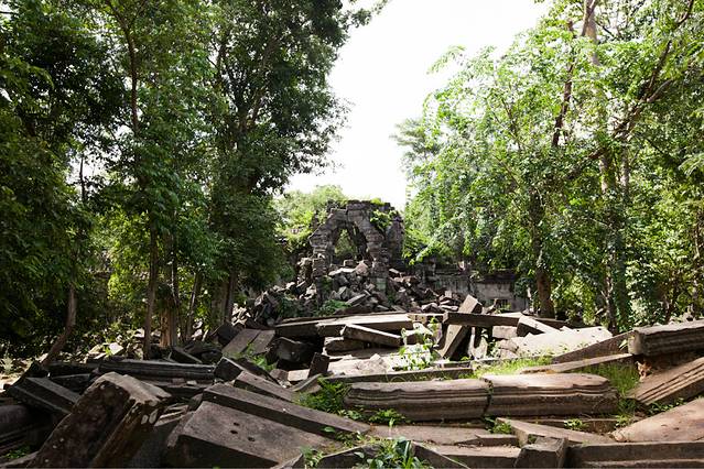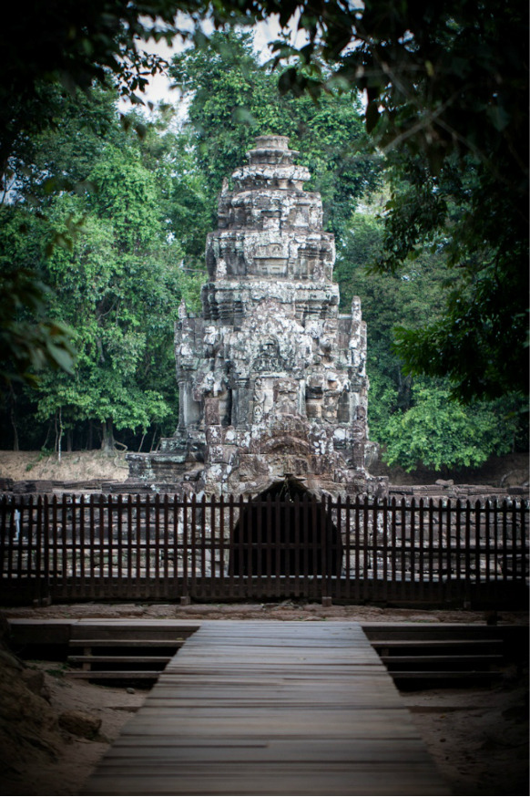 这是一座印度教寺庙,位于吴哥古迹群以东40公里,在热带丛林中,“崩”塌得很严重,废墟得有点像圆明园。当昔日繁华轰然倒下后,这巨大体量的遗迹,带给人的观感仍然是震撼。