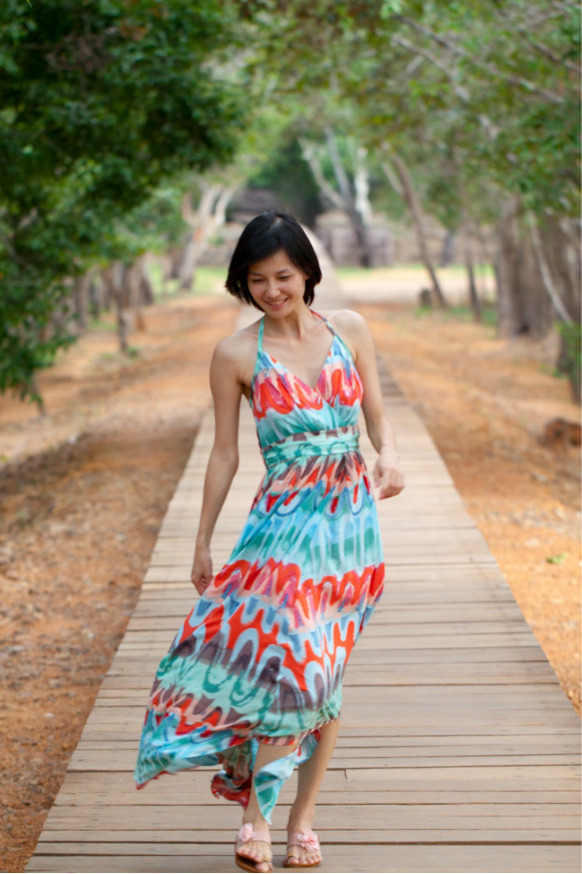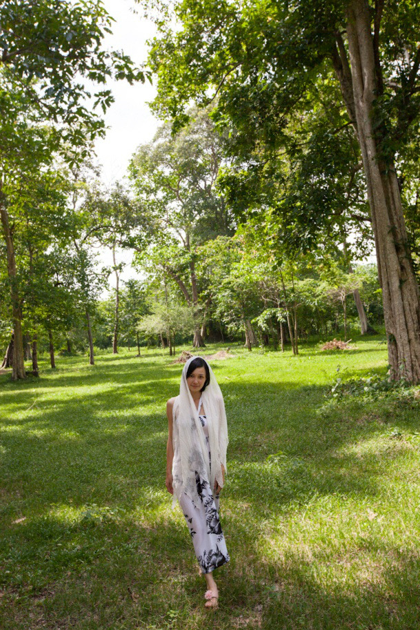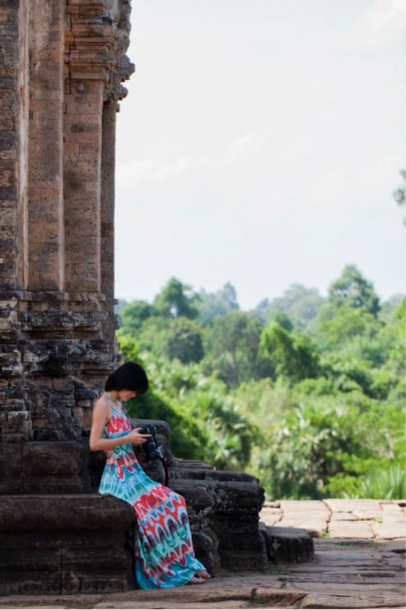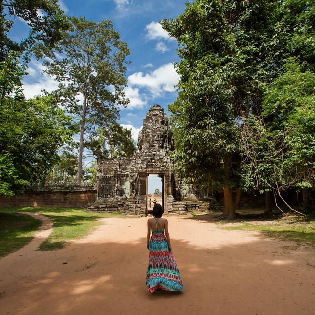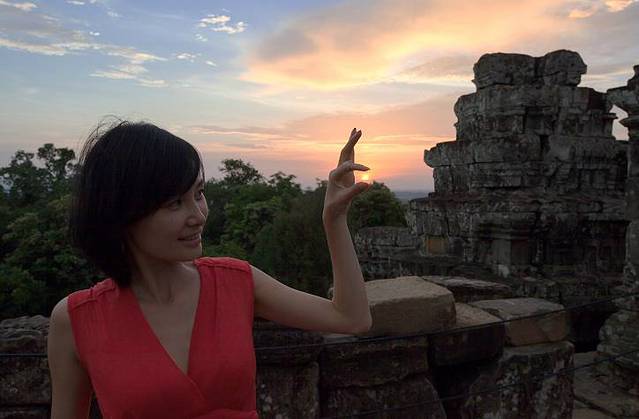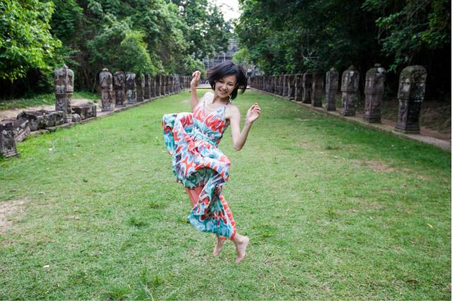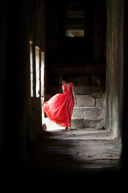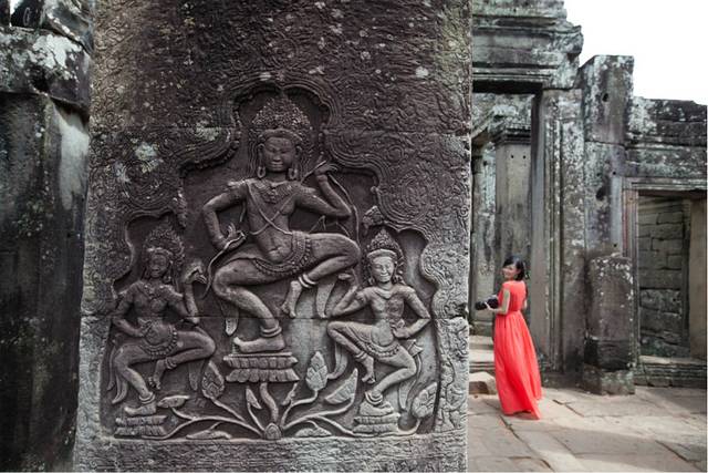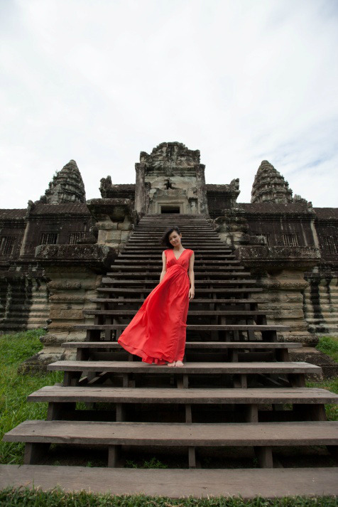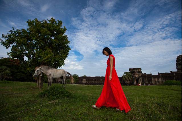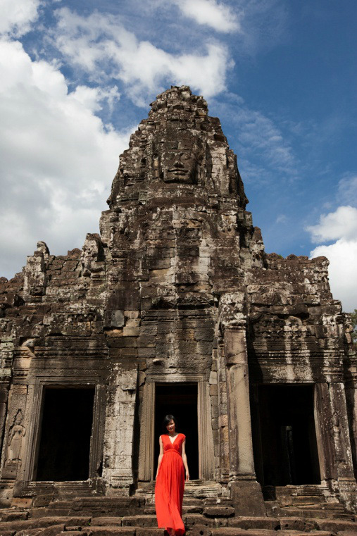 吴哥整个景致都以暗灰色调为主,所以穿红、橙、黄等亮色搭配就非常突出。而且吴哥都是大景,充满厚重感,选择飘逸的长裙比短裙要靠谱得多。