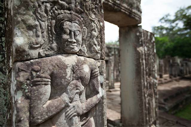 这座佛教寺院坐落于吴哥通王城(Angkor Thom,即大吴哥)的中央,有着精美雕刻的断垣残壁加上无数石柱,有如一个巨大迷宫,这里有高耸的石塔49座,每座的四面皆刻有巨大佛像。