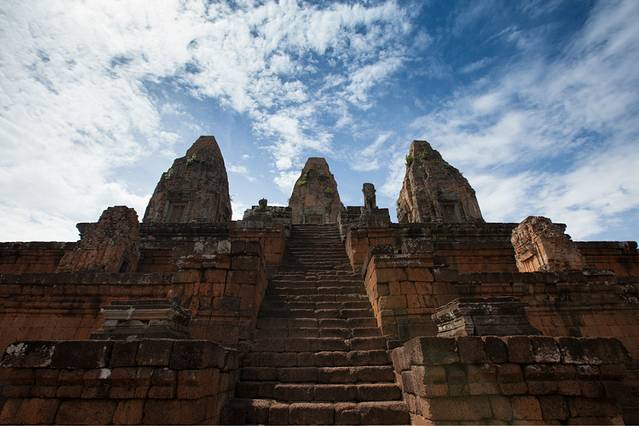 印度教寺庙,十世纪中叶建造在东池中央,现在池已干涸,寺台就显得很高。爬上高高的台阶,在顶层上有五座砖塔。而台阶下四个方向各有一尊大象雕塑,在古印度传说中宇宙是由四头神象支撑起来的。