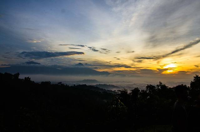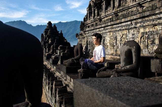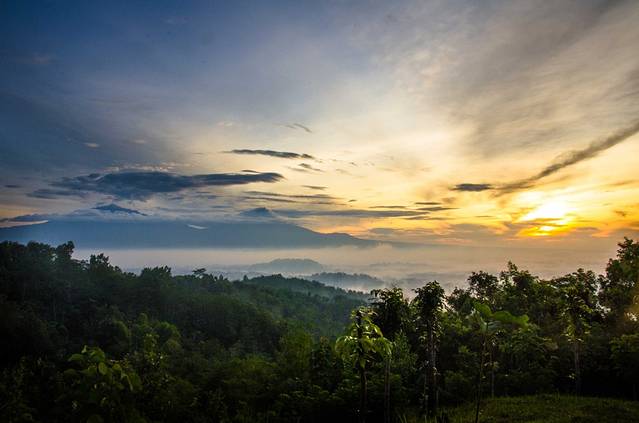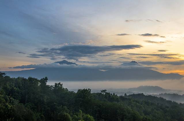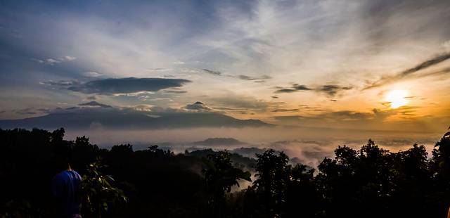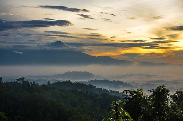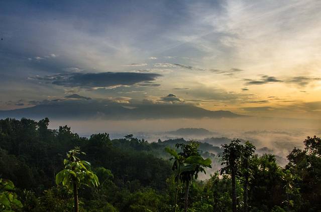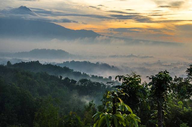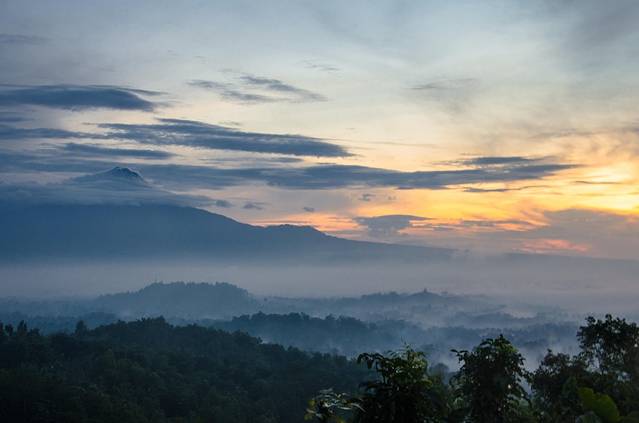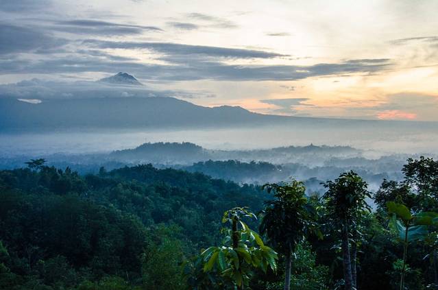 凌晨3点半起床,4点出发前往婆罗浮屠。婆罗浮屠看日出有两条线路,一条每人收费30000印尼盾,另一条每人400000。我们去的是便宜的那个,至今不明白另一个为什么贵出那么多。我们这个去的是一个小山,车停在半山腰,买票,爬山,大概十几分钟的样子就到观景台了。不得不说老天爷很给面子,在大雨季给了这么完美的天气,天上少云,地上还有平流雾,婆罗浮屠的神秘感有木有!在这遇到了比我小一天的贼能侃的美国小伙Mathew(米国人貌似大部分都比较能侃),此人不去说相声可惜了,当然也有可能是旁边有一妹子的缘故……走题了,嗯,日出很美!