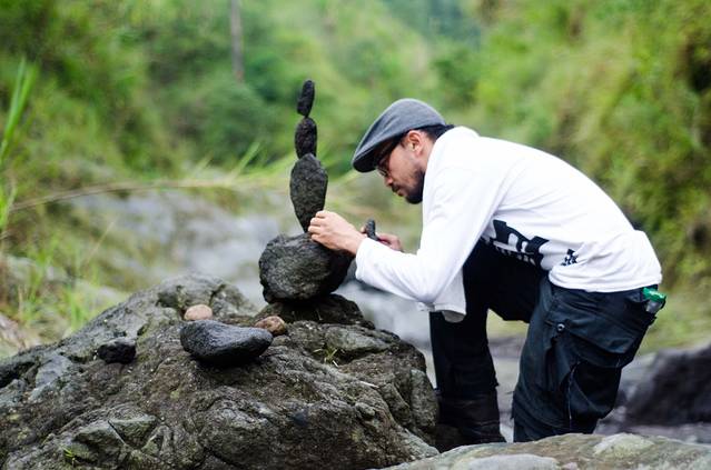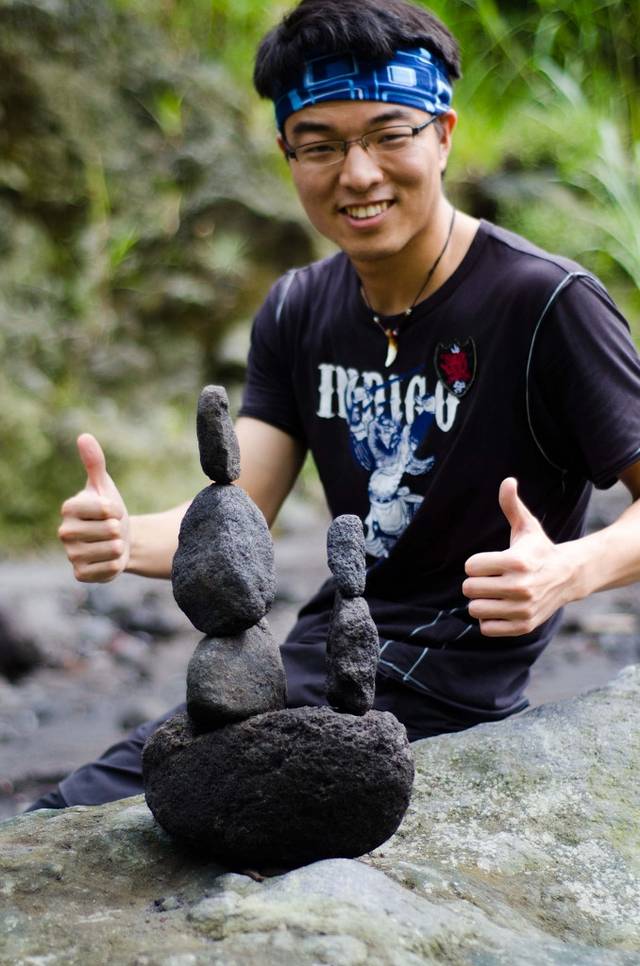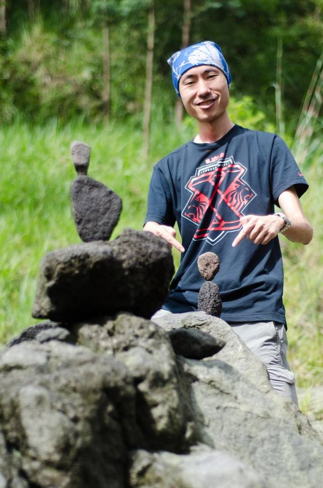听完讲解Aldrin就带我们上路了。总感觉这个小哥像影星,一问还真演过电影,不过是当替身的。路上跟他聊了不少话题,这个32岁的单身老男孩依然希望自己再多玩几年,对于找女朋友这件事完全不着急。我问他每天走同样的路线讲同样的话会不会觉得无聊,他说会的,无聊了就停一段时间,在家休息不带队或者出去旅旅游,过几天就好了。我又试探带队进山这件事是他自己喜欢还是父亲要求他做的,他说他很喜欢。小时候熔岩还没有吞没那边的时候,那里有条河,他很喜欢在里面游泳,还可以从高处跳水。现在水变成了石头,他又有了新的爱好。走到熔岩凝固的地方,他会停下来用火山岩叠罗汉。据他自己说最高纪录是21个。我们邀请Aldrin一起来拍Jump Shot,没想到小哥动作非常专业,我开他玩笑说他应该去多拍点动作片。