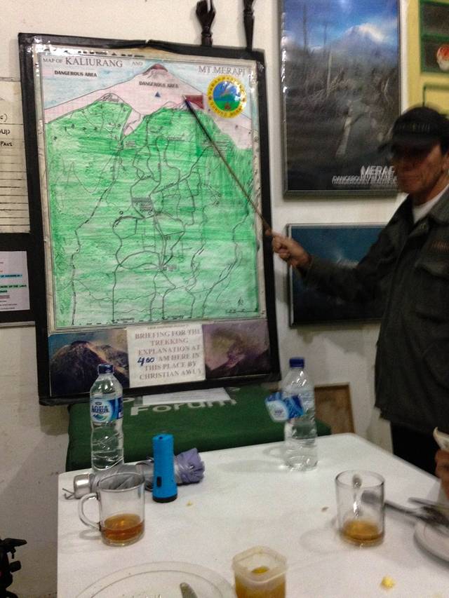 凌晨4点集合吃早餐。Christian老先生周日要去做礼拜,所以我们的导游变成了他的儿子Aldrin。老人说考虑到自己年纪大了,早晚需要有人接他的班,他就培训了三个年轻人,其中就包括他的儿子Aldrin。这三位现在都对默拉皮非常了解了。不过早餐后老人的火山讲解是必不可少的。老先生用“教鞭”在自己画的火山路线图上进行专业讲解。听完这段讲解就知道自己没白来了,不愧是最了解默拉皮的人。越是了解火山的人对火山越是敬畏。他每次带队进山都会强调安全问题,随身带着walkie talkie,每天的讲解内容也会根据当天的火山监测数据而有所不同。作为目前世界上最活跃的火山,默拉皮一直被严密监控着,每有风吹草动政府都会有提前预警,组织疏散。但是为什么2010年爆发还是死了那么多人呢?老人讲因为那群人不听话,他们觉得熔岩从来没有到过他们那个村,那里很安全。结果那个村死伤惨重。而比他们更接近火山口的村落由于及时撤离幸免于难。老人十分相信火山的神力,不得不说68岁的高龄还能每天带队进山徒步5小时是个很有说服力的论据。