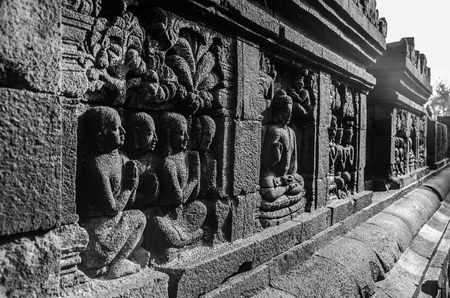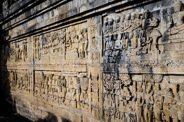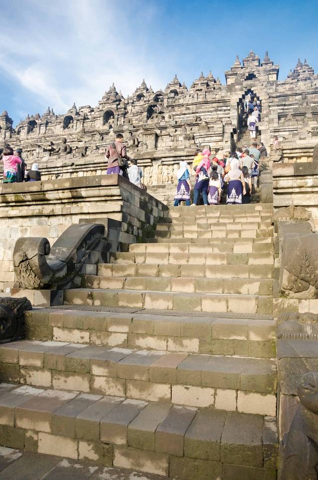 日出过后去婆罗浮屠,门票240000(看起来一直在涨价),学生半价,哪里的学生证都可以,过期了看不出来的也可以!进门要被强制围个“遮羞布”才可以进。想拍全景的请带广角镜头(或者有Panorama功能的手机)。这里的雕刻很精致,当然离吴哥窟还是有差距的。比较稀奇的是这里的穆斯林小朋友们,奔放得超乎你的想象!看到外国游客就各种求合影啊,有的还挽着胳膊照……