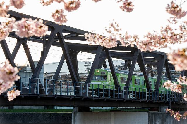 摄影需要善于发现,此处其实是坐新干线抵达京都站前附近一个小公园,于是晚上立刻独自出去踩点。第二天大早就来到这里,拍下了个人认为这几天最美的樱花照。阳光铁桥火车樱花...一切都显得何其自然,而且公园里捡到把伞也都利用起来了。不需要过多修饰色彩就能很完美的展现出来。