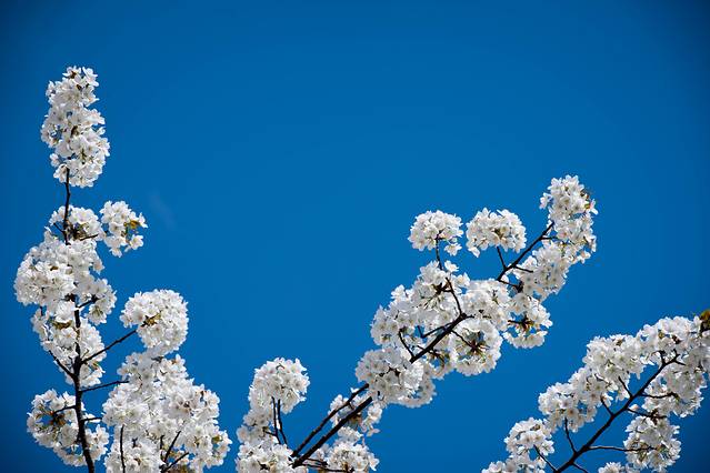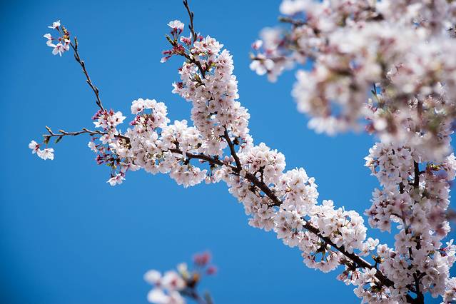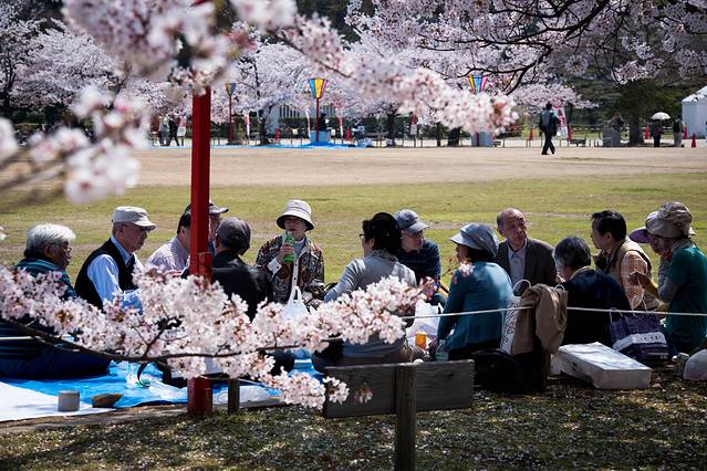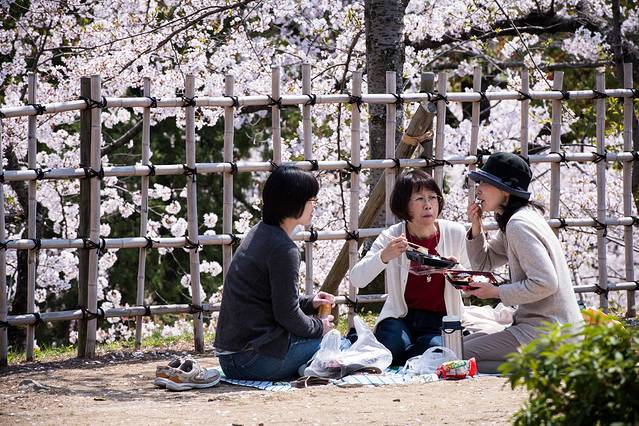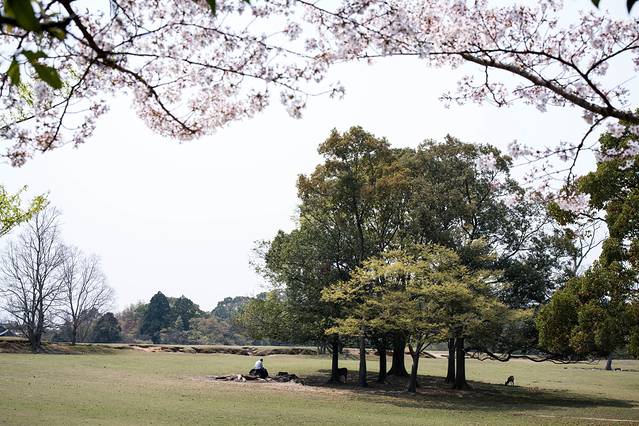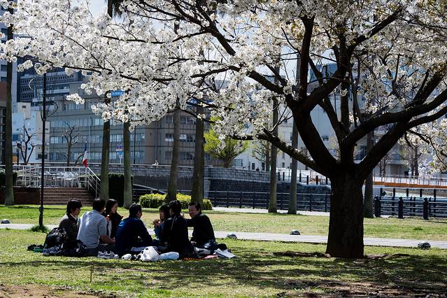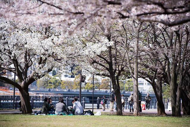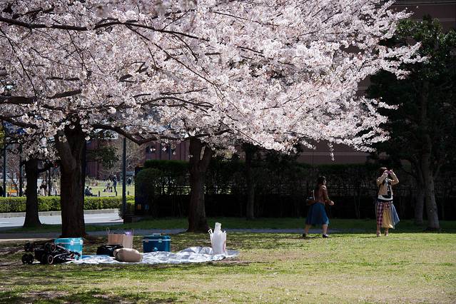 有片区域的樱花树到处都是,也有很多人打个地毯在草地上享受阳光。