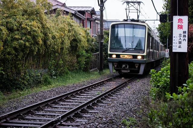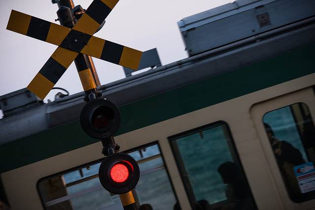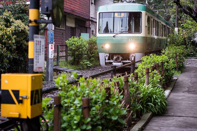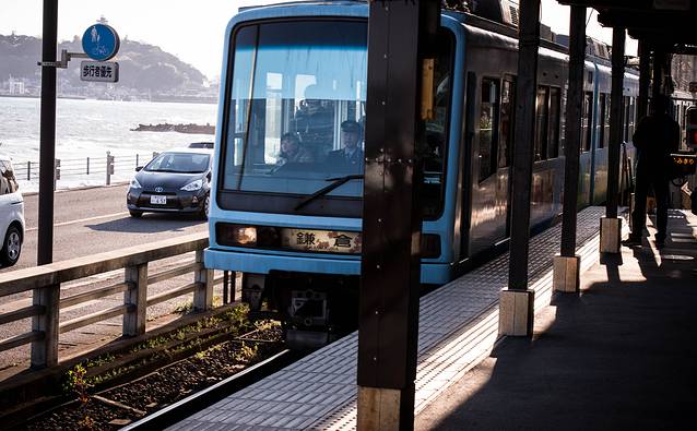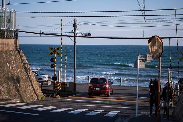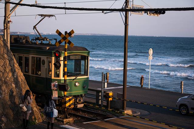 江之岛电铁路是非常特色的地铁,它穿行在民宿周边,所以每到一个路口警示灯都是要亮起并且放下禁止通行栏,但是也可以混进去拍几张照片的,不过要注意安全也不要用闪光灯影响到列车。