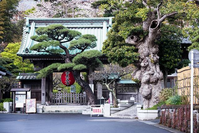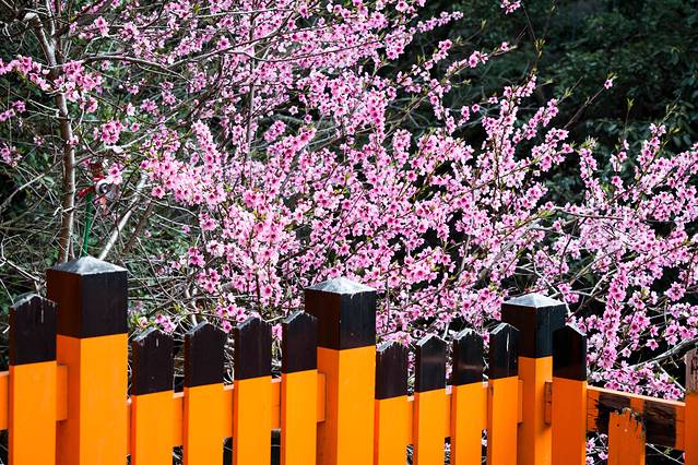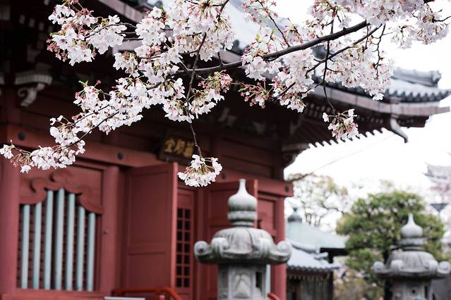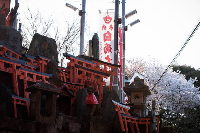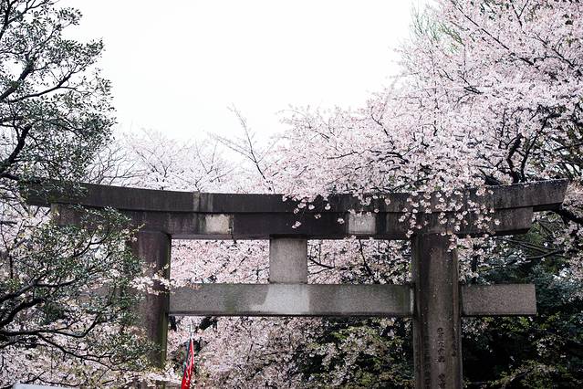 神社的标志性招牌,上面布满了樱花。