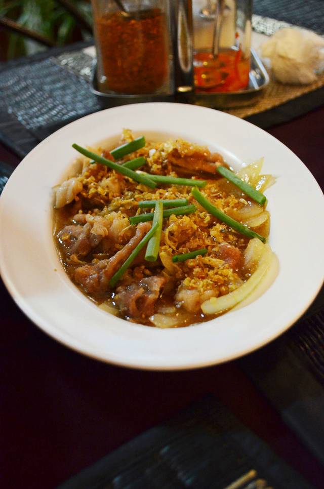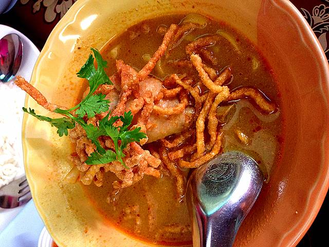 上面这个就是泰北的特色黄咖喱面,传说中的清迈面,英文叫 Khao soy,是将鸡腿和黄咖喱汤一期炖岛鸡腿酥软吃的时候里面放了煮面和炸面一起吃,这个味道不错,推荐