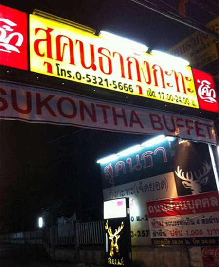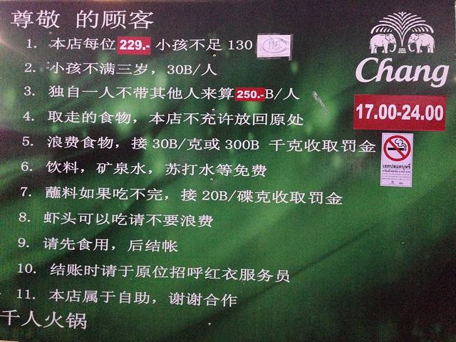 餐厅还是先从千人火锅说起吧,我们刚把酒店换到尼曼明路那天晚餐就是在千人火锅吃的,229泰铢一人,折合人民币也就40多块钱,千人火锅离我住的酒店不是很远,不过我们还是坐双条车过去的,大概开了五分钟就到了,吃完我们是走回酒店的,大概20分钟左右的步行路程,至于我们是怎么找到的,网上有张他们家招牌的照片,我就拿着攻略上的这张照片问司机知道不知道这里,司机说知道,那就上车走好了,去的时候记一下自己酒店到千人火锅的路,不远的话可以吃完散步走回来