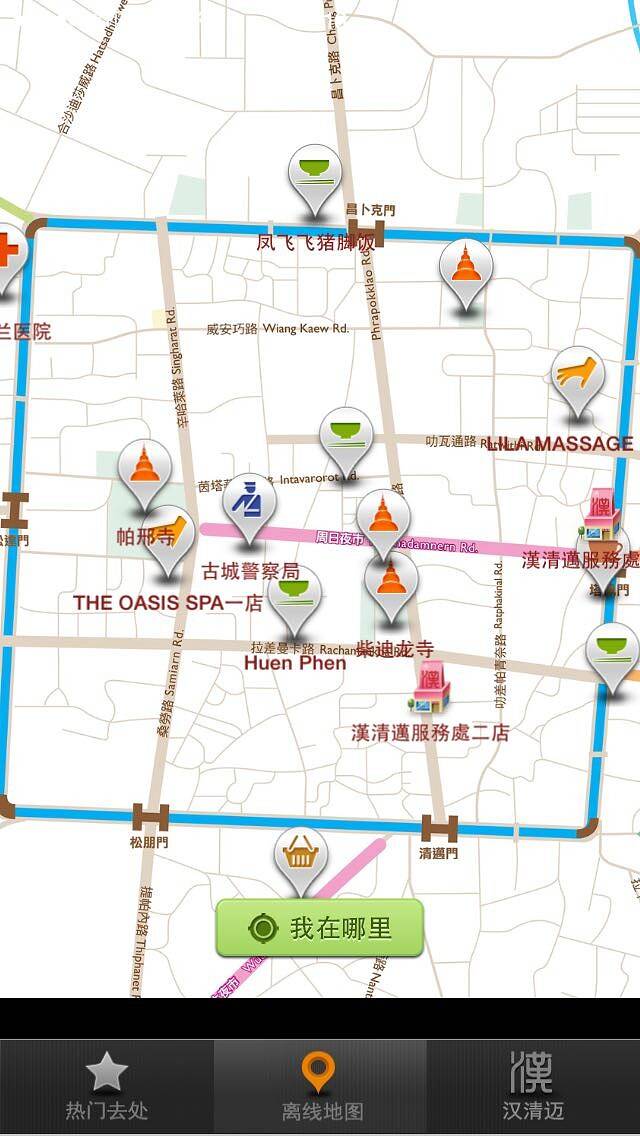 为了让大家能清楚明白三个寺庙的位置,特地把汉清迈中文地图上的位置给拍下来了,柴迪隆寺是在古城中心位置,帕辛寺位于古城西面,清曼寺位于古城东北面,塔佩门就是古城的东大门,请看下图