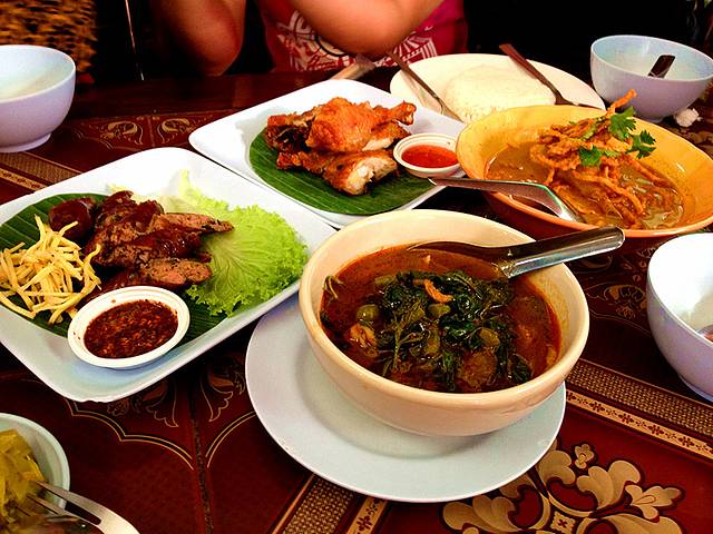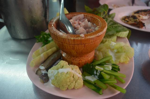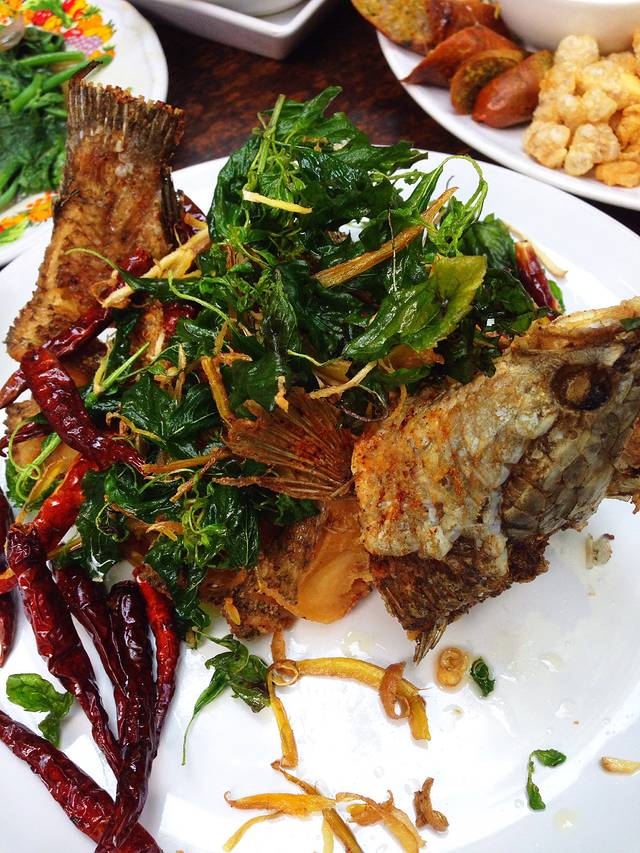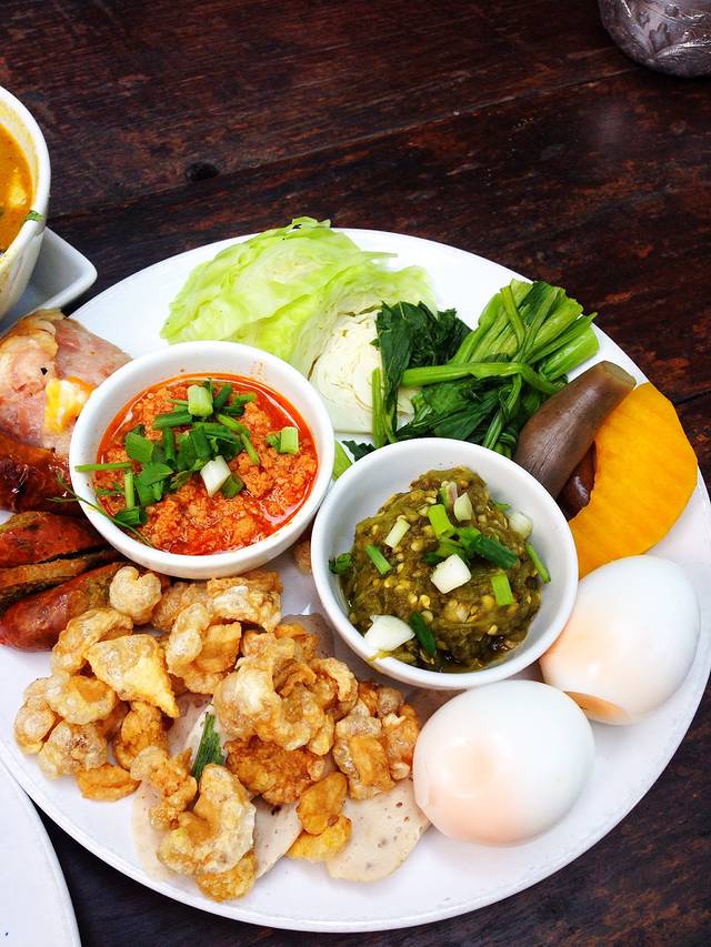 下面就是泰北特色小菜拼盘,蔬菜都是清水烫过的,左上角泰北香肠边上便是当地特色的酸肉吧,吃起来口感像是泡过柠檬,下面的炸猪皮,吃起来其实类似于油渣。其实这道菜跟之前在普吉岛潘潘吃的蔬菜拼盘类似,都是蘸着中间的酱料吃,只是酱料不一样,边上的蔬菜种类不同而已