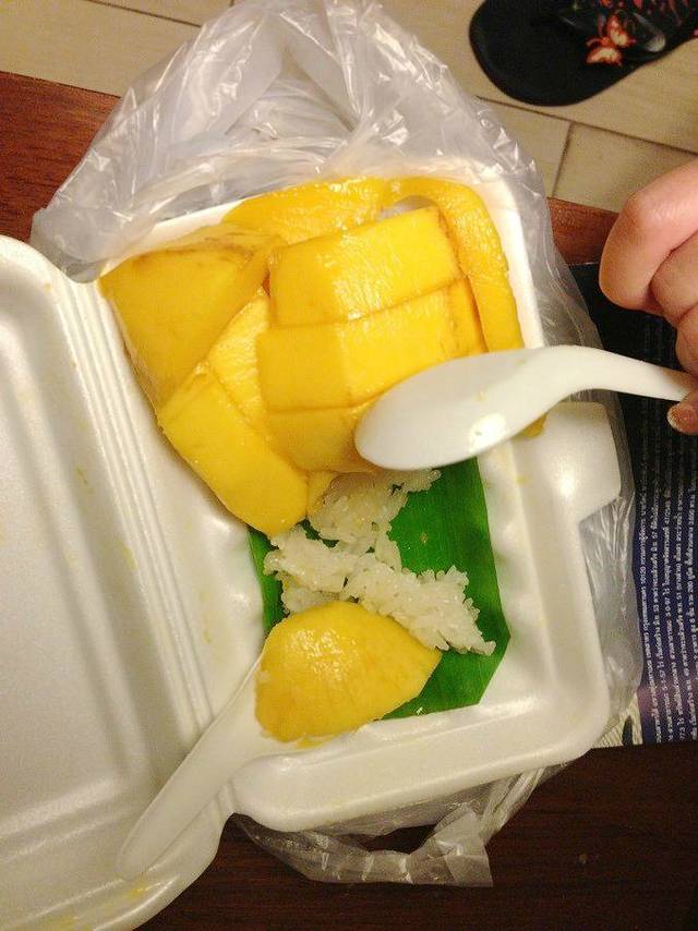 这个是我在周六夜市买的我认为我在泰国吃的最好吃的芒果糯米饭,不是很甜但很爽口