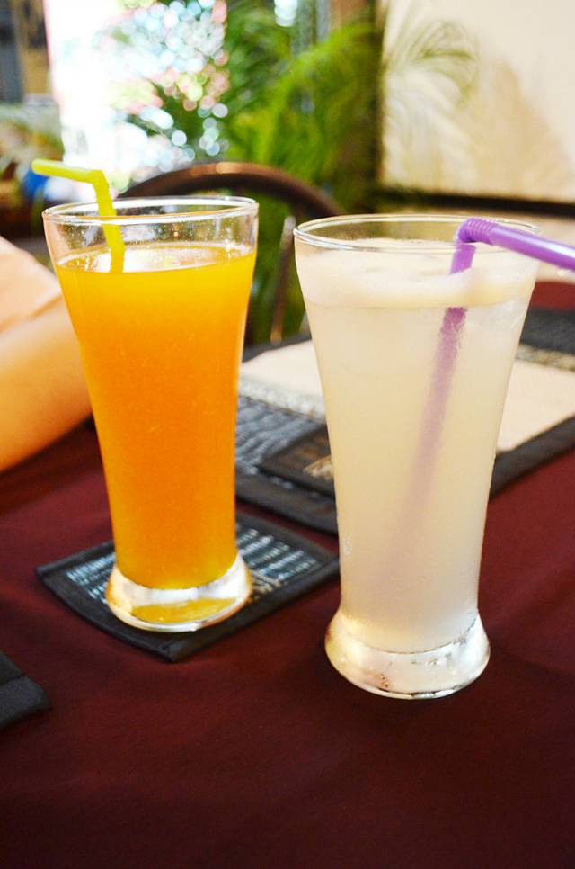 上面这个混合果汁是服务员推荐的,酸酸甜甜的味道比较符合我,下面这桌才基本都是找服务员推荐给我的,除了那个蔬菜拼盘是我拿着英文让服务员给我点的其他都是服务员推荐滴,下图绿色的蔬菜其实是南瓜苗