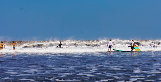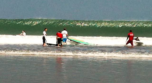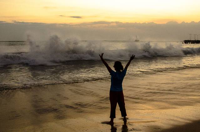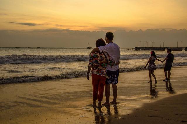 警告:Kuta海滩浪大,不适合游泳,想下海的朋友不管水性如何,千万不要进的太深!浪虽是往岸上打的,打完后回抽的力也很大,很容易把人吸进去。老爸就是因为站的太靠里,几个浪就被吸进去了,Dani一看不对赶快去救,但是浪太大,一会儿Dani就坚持不住往外撤了。我当时就慌了,火速上岸喊人救援,喊人喊得肺都快喊出来了。好在老爸够沉着,慢慢耗着自己游出来了,救援人员下去一半发现人已经出来了。虽然是有惊无险,这下把我吓得不轻,不夸张地说后面几天一直就没回过神来,带的这些队员真是不给团长省心……想想真是后怕,那个浪见过的人都会明白,根本不是一般人可以handle的。