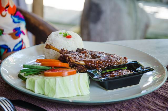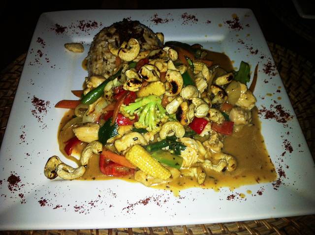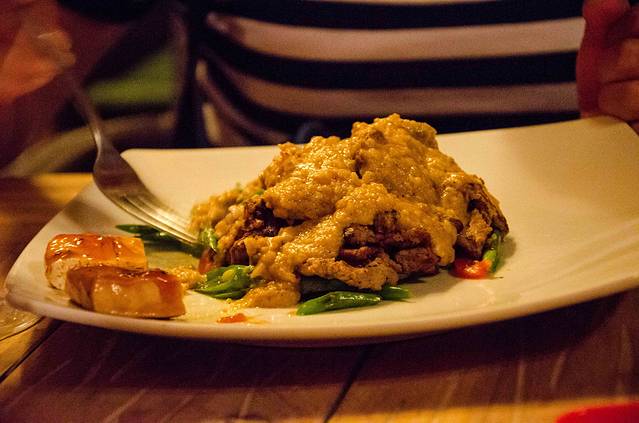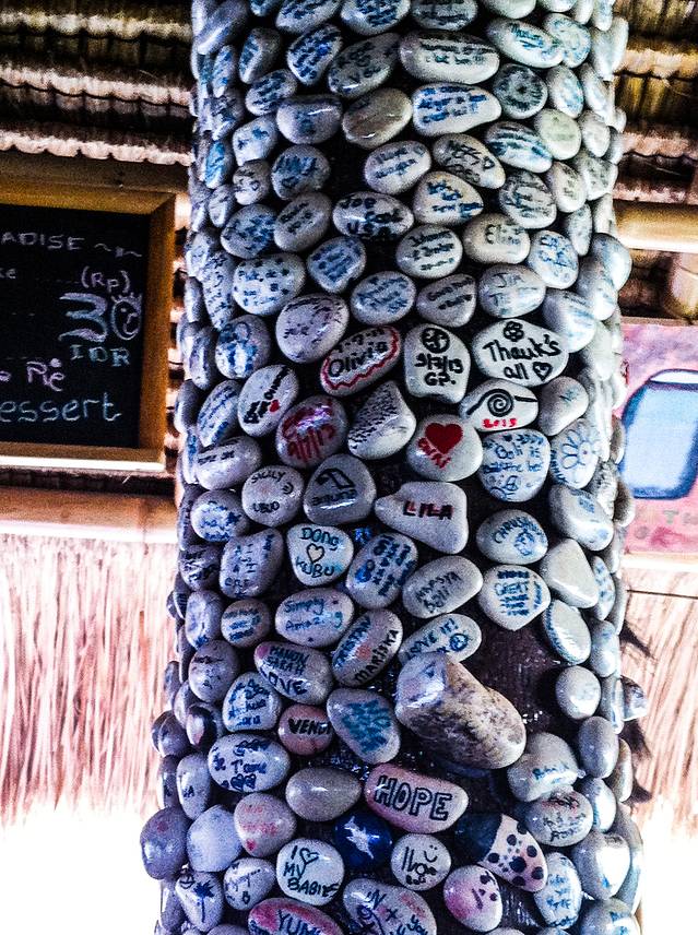 这家大名鼎鼎的Fair Warung Bale出名是有原因的。这是一家慈善机构办的餐馆,所有盈利全部用于建医院,为贫困人口提供免费医疗等。餐馆的工作人员也都是志愿者。这里菜单上的菜也都是志愿者们发明创造的,很多菜名旁都标注着发明者的名字和时间。餐馆规模不大,布置很特别,立柱上贴满写着祝福的鹅卵石,据说都是捐款的顾客一个一个贴上去的。这里的菜品口味中规中矩,来这里体验多过味道。目测只有两个锅,上菜很慢,我们六个人的菜等了足足一个小时才上齐……