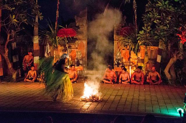 Kecak Dance特别之处在于它的背景“音乐”完全靠人声,就是围坐的那圈赤膊的喊的“cak,cak”,他们会根据情节变化音调和节奏,配合故事发展。故事本身源自罗摩衍那,Ayodya王国王子Rama及王妃Sita遭后妈陷害,被国王Dasarata放逐到Dandaka森林,做伴的还有Rama兄弟Laksmana。Alengka国王大反派Rahwana觊觎Sita美色,派宰相Marica执行任务。Marica使用调虎离山计陆续引开Rama和Laksmana,但Laksmana走前在Sita周围画了一个圈保护她不受坏人袭击。Marica又运用苦肉计诱骗Sita走出了保护圈将她掳走(这段像极了三打白骨精有木有!鬼知道吴承恩看没看过这段……)。神猴Hanuman作为Rama的使者找到了Sita,并传信召集人马救援Sita。与此同时Rama和Laksmana被大反派Rahwana的儿子Meganada打败,被困住不能动弹。Dasarata好基友神鸟Garuda救了兄弟俩,然后猴王Sugriwa带领他的猴子大军击败了Meganada的恶魔大军,救出了Sita,王子和王妃从此幸福的生活在一起……
