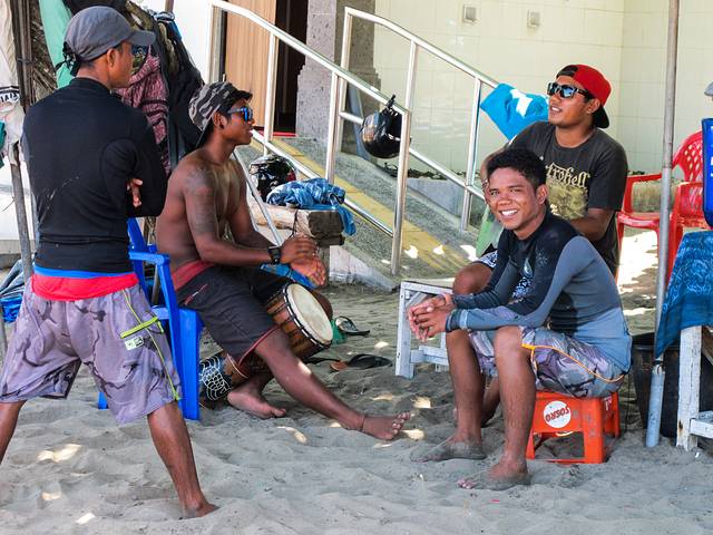 餐过后奔赴Kuta海滩,上午的主题是学冲浪。行前觉得这项运动不太适合父母这个年龄段的,挡不住老爸浓厚的兴趣,就带他一块玩玩吧……