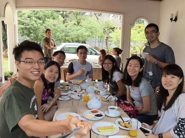 清晨站在旅馆房顶上,景色相当不错,还有各种鸟鸣,心情大好~主人还告诉我顺着一条小路往下走,在河边经常可以看到Kingfisher,一种捕鱼的蓝色小鸟,居然还真被我碰到了,只是太远镜头不够给力没抓到……还有一种大白鸟每天早晨5点到6点会从房顶上方成群飞过,等到傍晚蝙蝠出动的时候再成群飞回来。每天欣赏着如此美好的环境,也难怪主人性格如此平和。