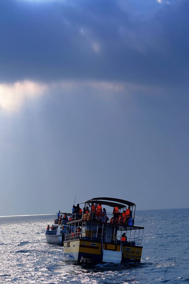 观鲸这一项之前还查了好多家,真正去了才发现真的没必要,因为每天早晨Mirissa的港口里十几二十艘观鲸船长得都是一样的,不管你在哪艘船上,标配救生衣+早餐,看的也都是同样的蓝鲸。二十艘船相距不过几百米,一旦发现踪迹从来都是一哄而上。只是有些人“聪明”一点,做个网站,放上Trip Advisor,鼓吹一下他们怎么跟别人不一样,他们不会过于靠近蓝鲸,致力于保护蓝鲸云云,以博取游客好感,实际操作其实所有船都是一样的。