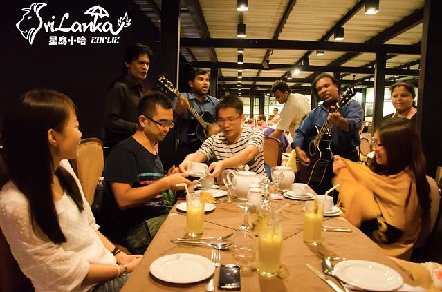 司机真把我们当土豪,净带我们去高档餐厅……这家餐厅建在Kandy半山腰上,风景很不错,饭餐质量一般,服务生严重差评!居然敢对我们说“can you order quickly, I'm very busy!” 好在乐队够给力,献唱过《月亮代表我的心》和《茉莉花》后又加了一首斯里兰卡的歌,也就是背景音乐《Mango Kalu Nande》,Prasad告诉我们这首歌讲的是一对恋爱男女遭父母反对的故事,旋律跟印度神曲风格完全不一样啊有木有!