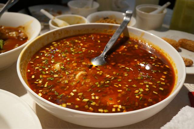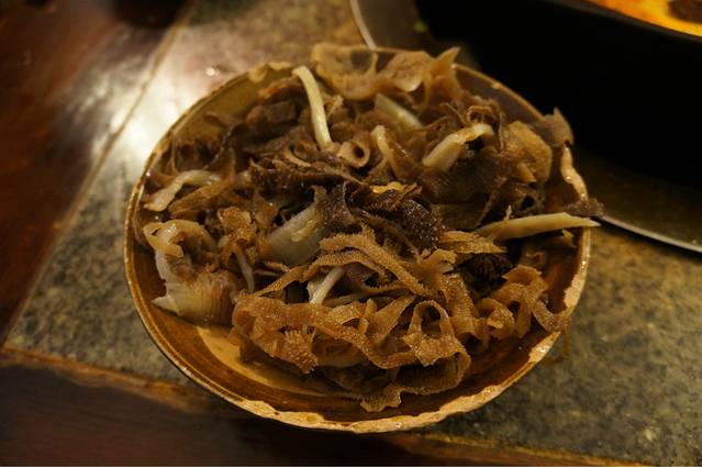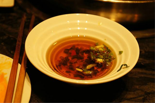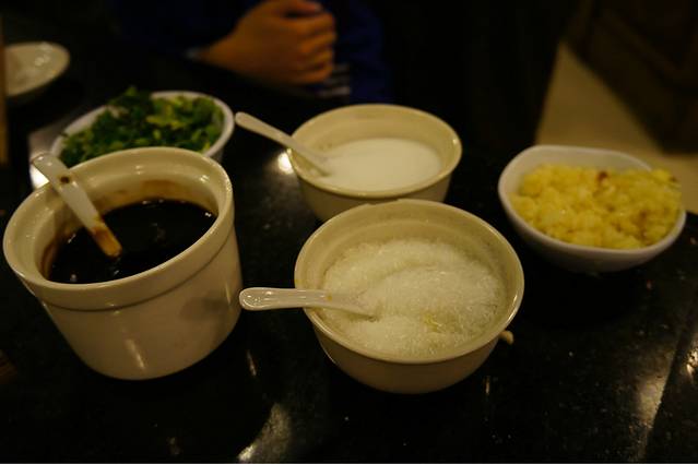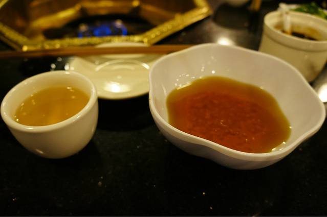 平时习惯火锅蘸料加好多样满满一碗,可是四川的火锅蘸料很简单——一碗牛油,令可加蒜泥、香菜、醋等。开始瞅着这蘸料挺犯怵,蒜泥坚决不要的啊,香菜也不太喜欢啊,但是吃过半程才发觉一定一定一定要加醋啊,美味到不行啊!