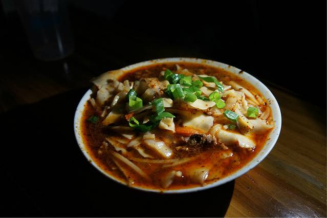 一个白天的奔波又处于极饿的状态,check in后随逛觅食,看到一家“江湖味”生意好的很,就想也凑个热闹,结果发觉那真是大大的忽悠啊!价格贵也罢了,偏偏端上来的菜简直像吃剩下的实在是令人发指!明显没吃饱的四人又遛到隔壁一家小店去吃面,便宜又有味,而且等面中居然停电了,店主很淡定的表示这是常态,拿出蜡烛给点上,瞬间成了烛光晚餐了,这。。。