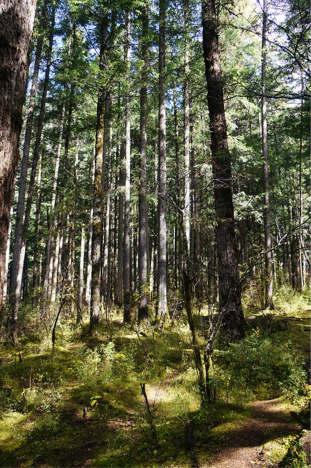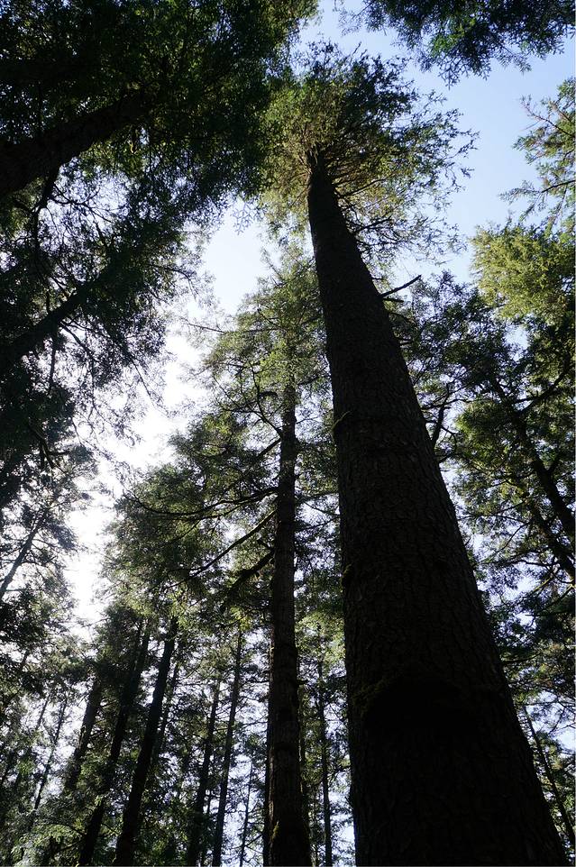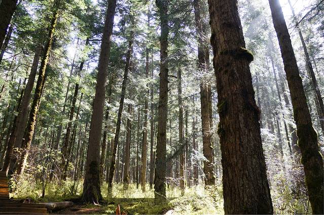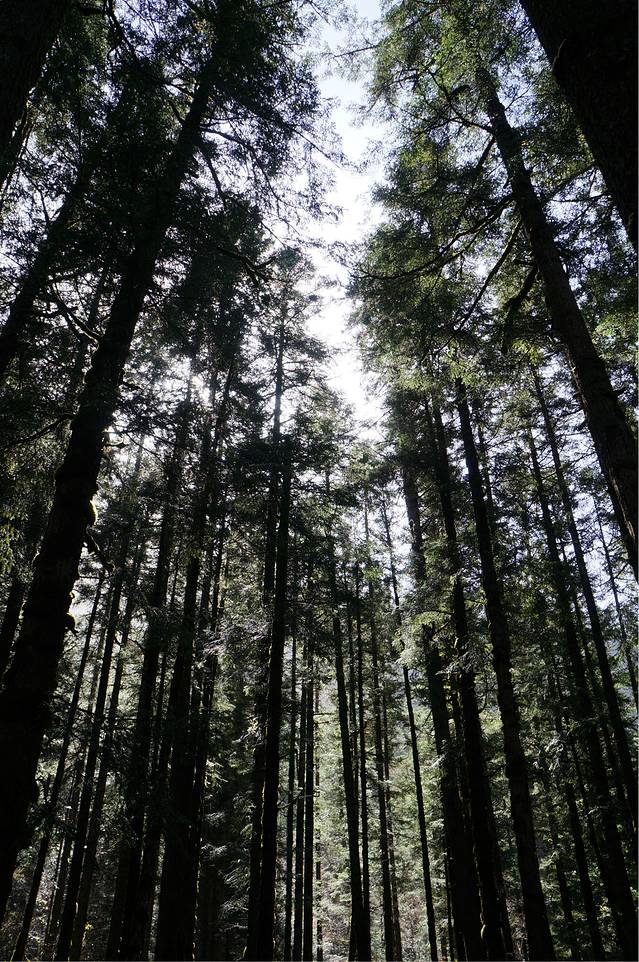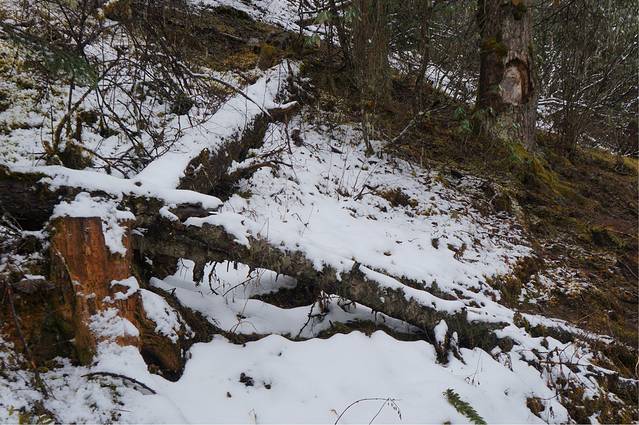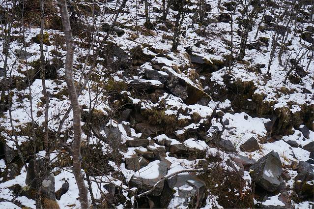 此时已经下午1点左右,原始森林的低温却瞬间让敞开外套的我赶紧紧紧衣服裹好围巾,沿路积雪在阳光下逐渐融化,自然也有背阳化不去的雪,拐入原始森林中,参天杉树上化开的雪滴落而下,形成了一场不小的雪雨,大家纷纷撑伞行过,但树木交错间分明有着明艳阳光洒落在树干上灌木上苔藓上,这种美妙的交错感令人行走其中,心旷神怡。原始森林空气质量极好,有着极高的负氧离子含量,已然是一个大氧吧,感紧深深的呼吸,再呼吸!