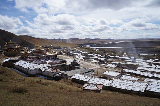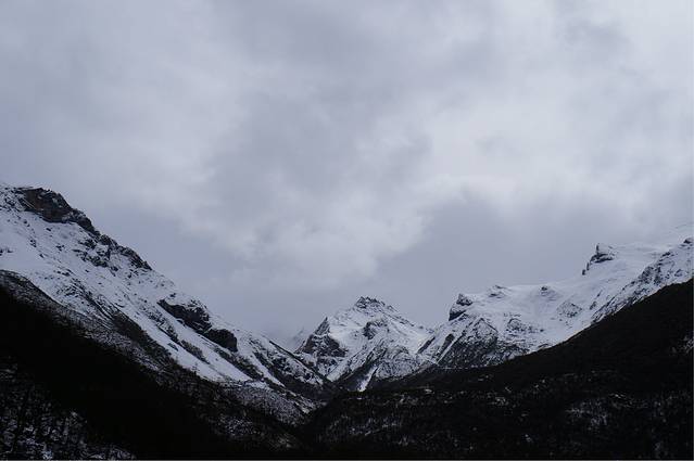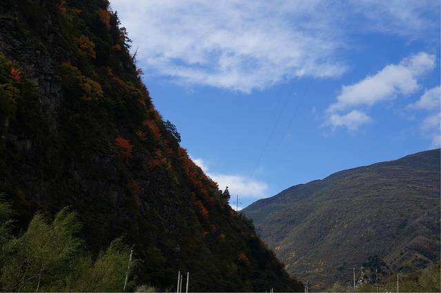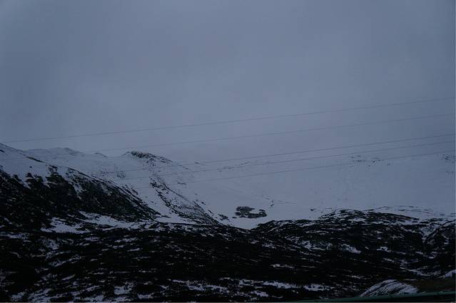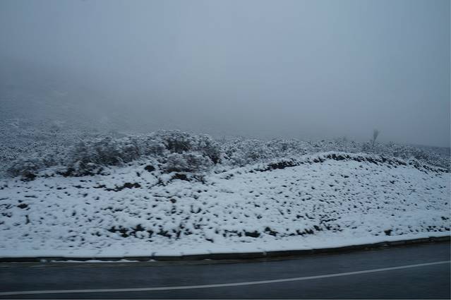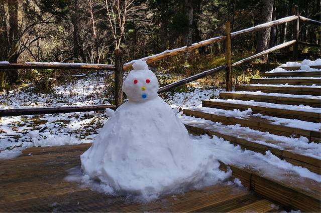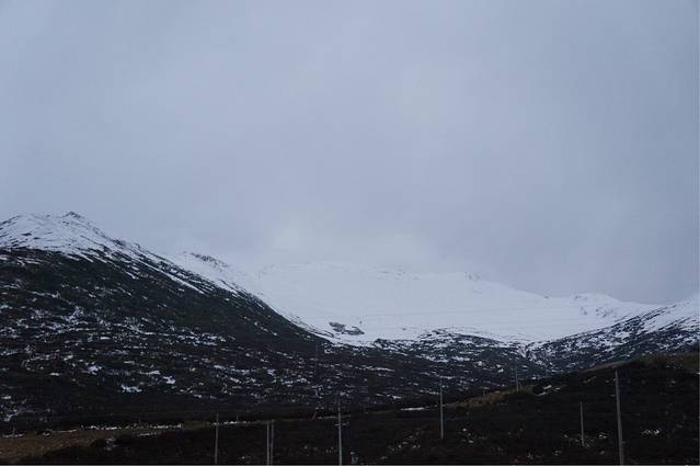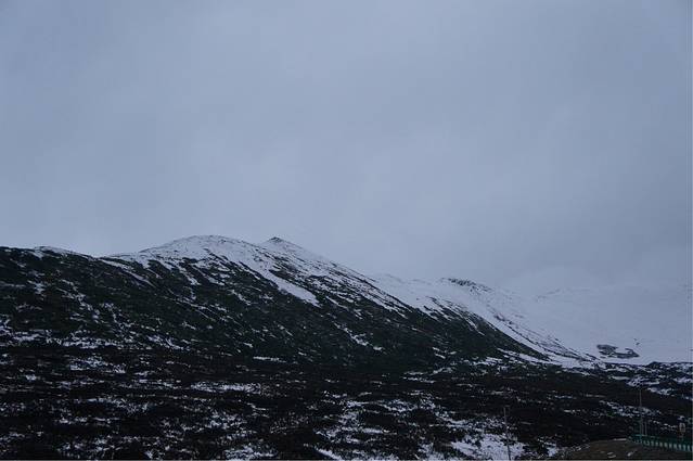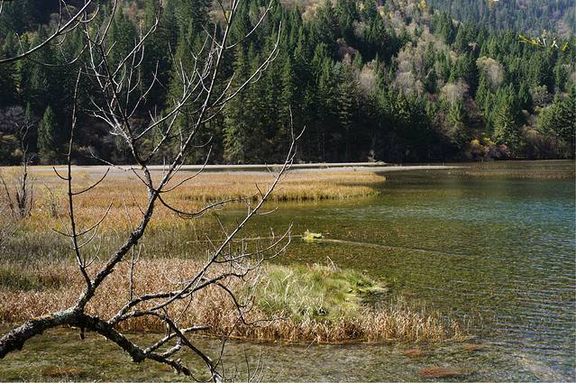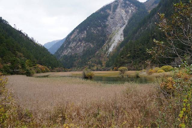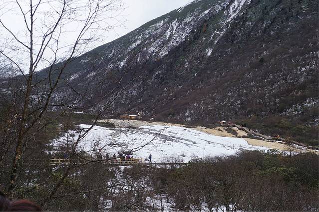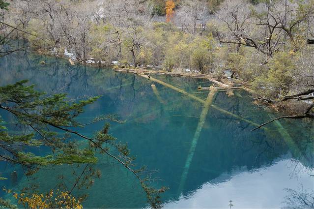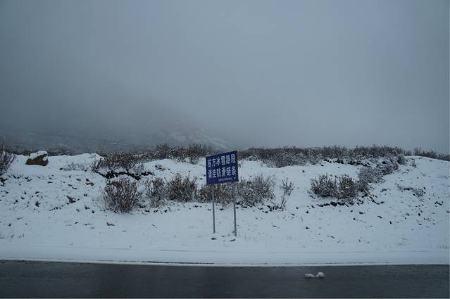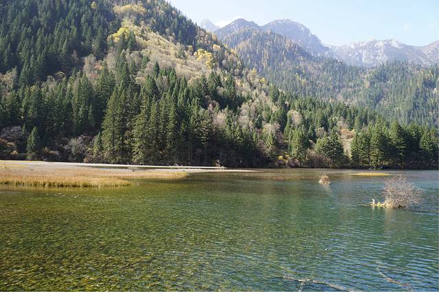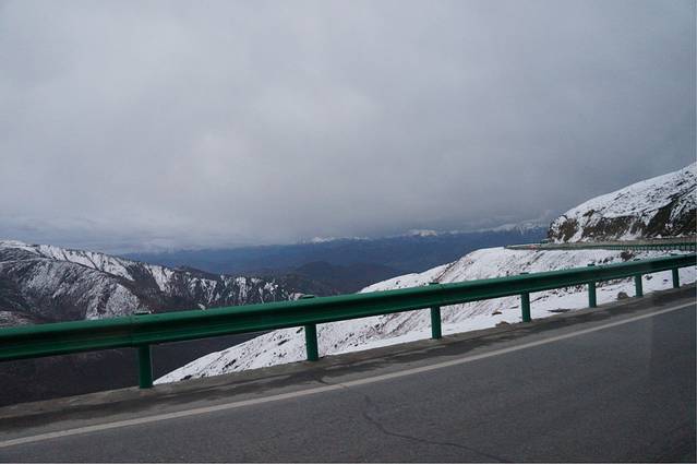 渐行渐远,突然发觉身边的景色早已不是九寨的五彩风采,秋意盎然了。远处的高山上都覆盖着点点白色积雪,恐怕这些积雪很久未消散过了吧