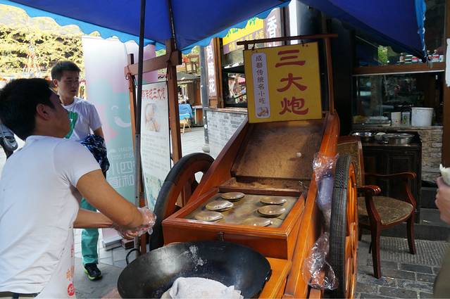 吃爽了想打道回府,突然发现路边有人在先做三大炮,我给朋友解释何故就叫三大炮来着,于是我们看着现做现卖赶紧买了份来品尝,妈妈咪呀,前面龙抄手店里的三大炮那是多坑爹呀,我们直呼好吃,瞬间原本觉得来远了的文殊院变得好超值!如果不是马上要去吃晚饭好像再吃一份呀~~~现在想来还好怀念啊,我又在晚上想吃的了,口水,口水~~~