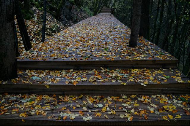 清早,连工作人员都还来不及扫除的落叶铺满了每一段我们走过的栈道,仅是这满满落叶已经把我吸引到无法移开步伐,心情大大感慰!