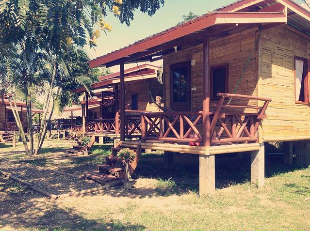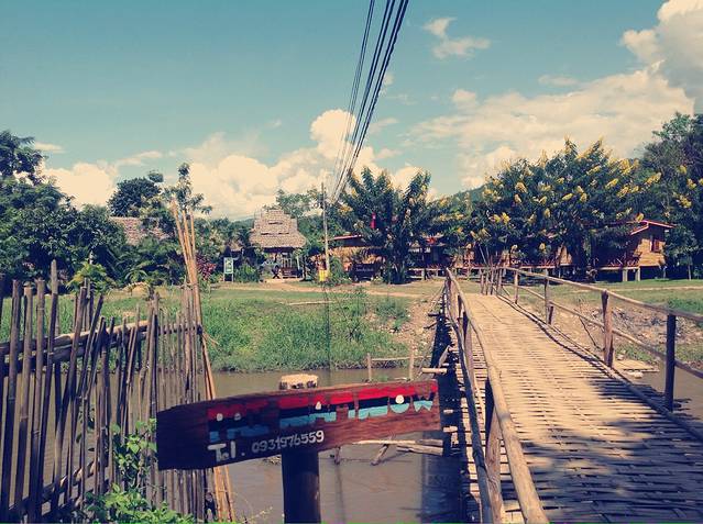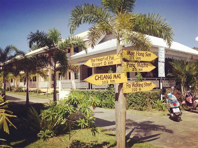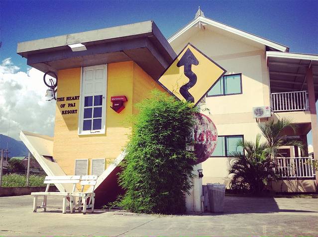拜县LZ只住了一晚,在Agoda订的是The Heart of Pai Resort,一晚120元人民币。选择这家是因为它倒过来的房子非常有特色,而且环境很好,价格也便宜,重点是非常容易找,因为mini van去汽车中心的时候就必定经过Heart of Pai,所以下车以后,我们在Aya租了两台小绵羊,沿路返回就能找到酒店,根本不需要什么地图,一路过来就能知道路怎么走。它的位置大概就是在进入了拜县,往县中心走的必进之路上。