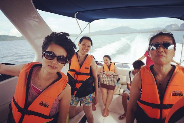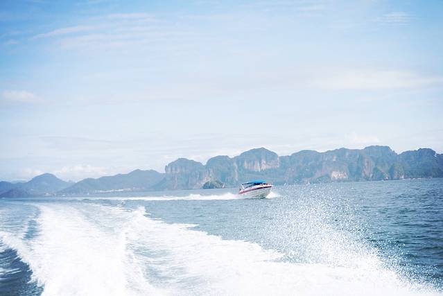 一早7点就在酒店门口等,因为双条车要接好多个酒店的人,所以就稍微等了15分钟,接好人以后就送到码头坐快艇。这里要提醒一下筒子们,快艇和长艇是有区别的,Speed Boat是快艇,Long Boat就是那种比较慢的,在预定参团的时候一定要说清楚是哪一种船。Speed Boat的船内环境不错,都是很新的快艇,没有那种豪华游轮那么漂亮,但是非常干净舒适,一艘快艇大概可以坐20来个人,喜欢看风景的可以去船头坐着,就是风大了些,不过看景色是很漂亮的。