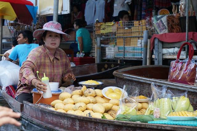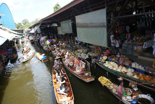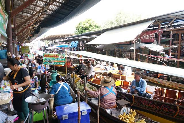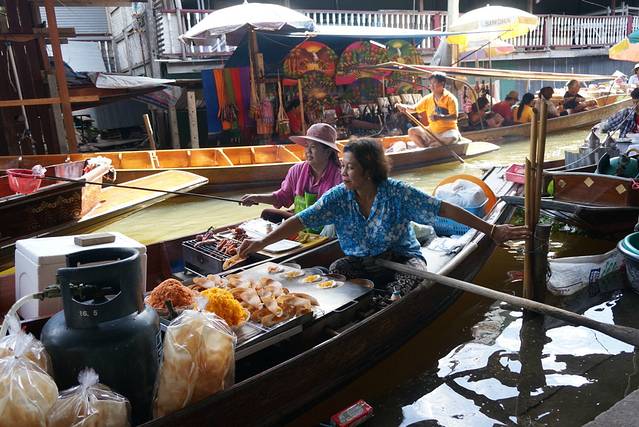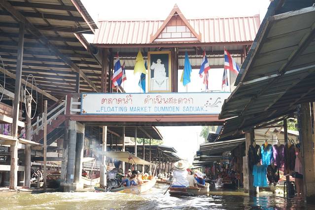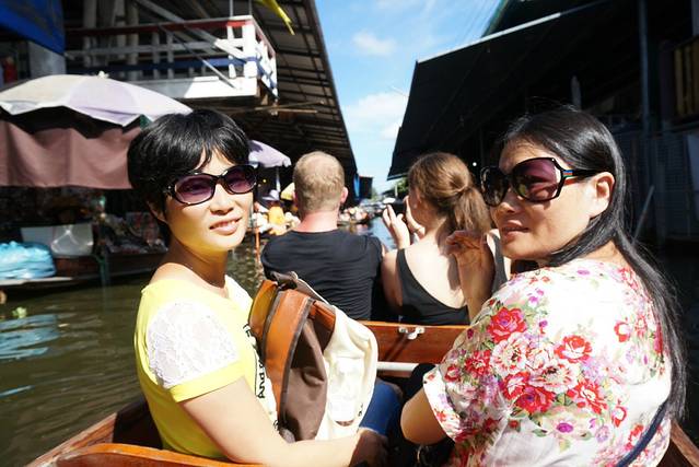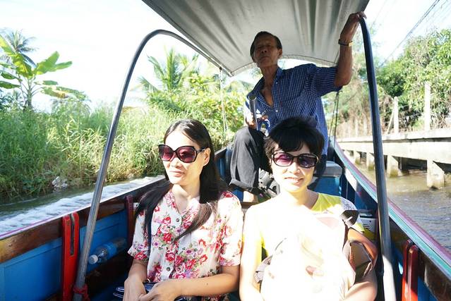 Mini Van下车以后,会让我们坐一艘小的接驳船,在水上市场上岸后,就可以自由活动,如果想坐船游览水上市场的,需要另外买船票,差不多10个人一条船,可以坐着游览大约半小时,如果想单独包船就很贵了,问了一下开价要2000B。在船上如果经过的地方想买东西可以示意船家停下来,甚至有的时候会边开船边交易,所以最好准备些零钱。我发现在水上市场的东西并不便宜,游览一下还是可以的,但是买东西的话确实没必要,基本上在船上买的都比较贵。