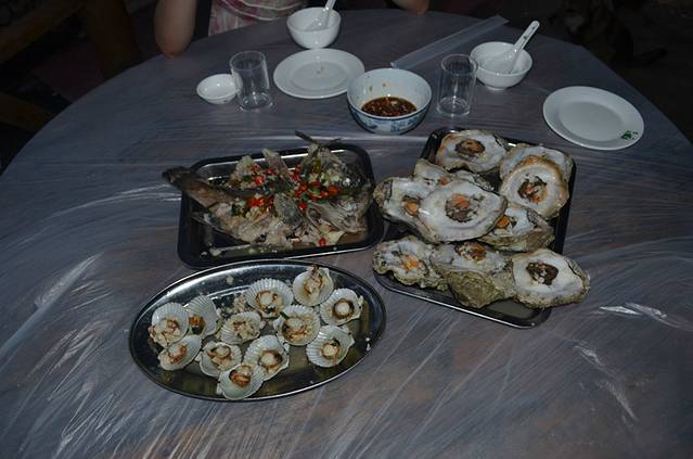 石螺口海滩是我们当天环岛游的最后一站,之后师傅带我们去买海鲜喽,下面的一桌菜还是宾馆厨房加工的,岛上海鲜好便宜,生蚝才两块钱一个