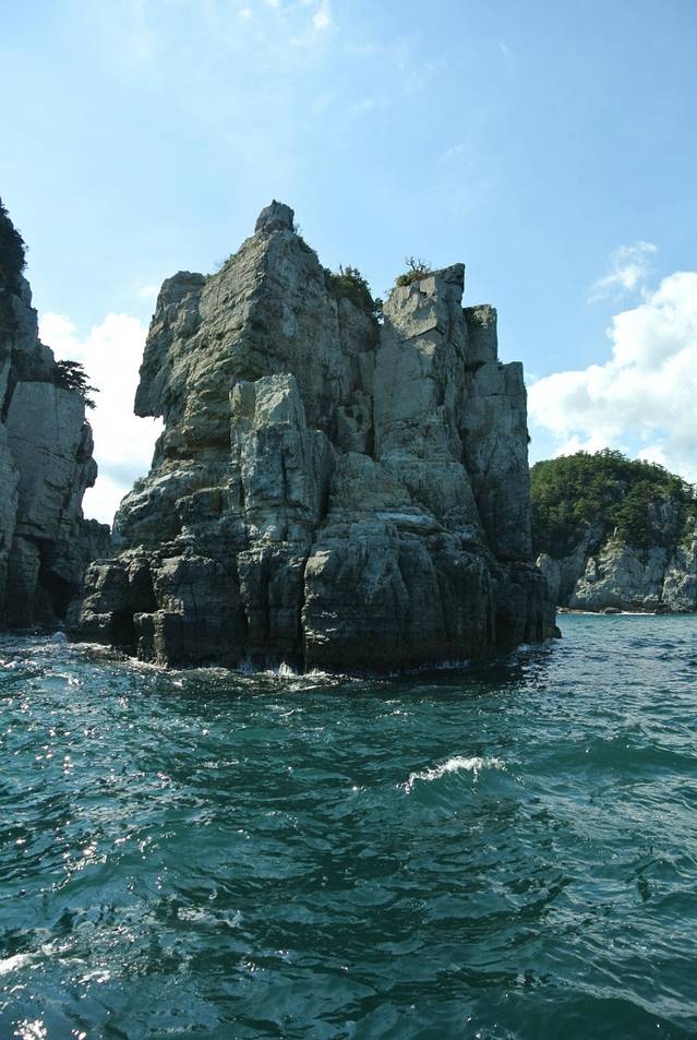 在游览船卖票处买票,外岛+海金刚一共是25000,排队坐船,船上会有船长讲解。先到的是海金刚,我一直不明白就海上一个寸毛不生的石头岛有啥可看的。虽然韩语不咋地,我还是能大概听出来,船长不停的在对着不同的石头发挥联想。海金刚 (해금강 )那个地方是在船上观看的,船会熄火停一会儿,海浪超大,船超晃,晕船的亲么最好不要站在船舷上。