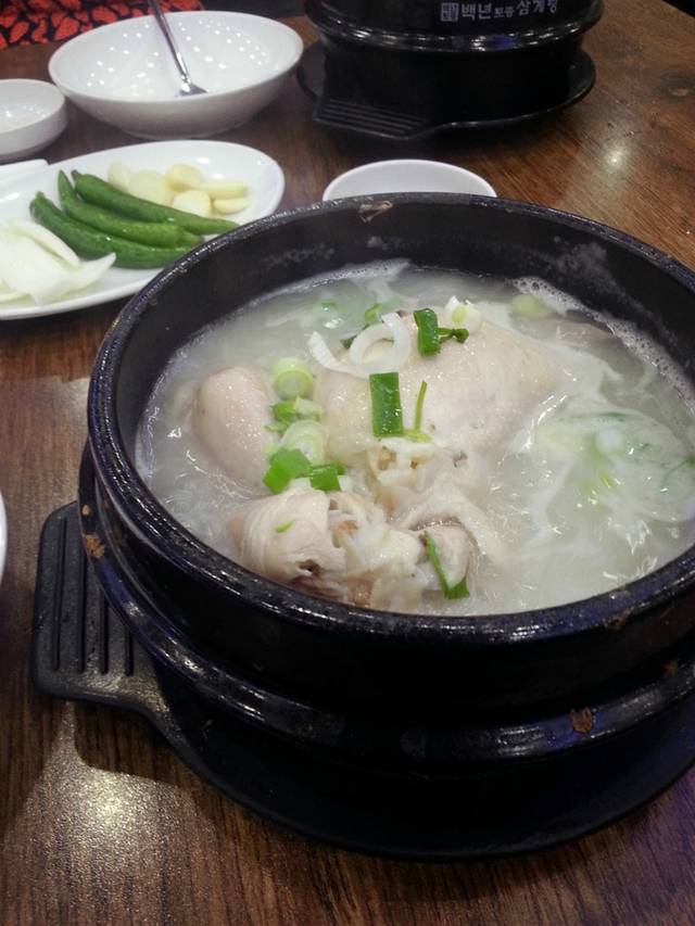 因为弘大和合井只有一站地铁的距离,于是选择走过去(小远),路上碰到了百年土种参鸡汤的总店,来了韩国总要尝尝参鸡汤嘛(口重的人慎吃)。13000一份,进门真的没有人问你点什么,就问你要几份。据说这是韩国人夏至时候吃的传统美食,韩国人也好奇葩。