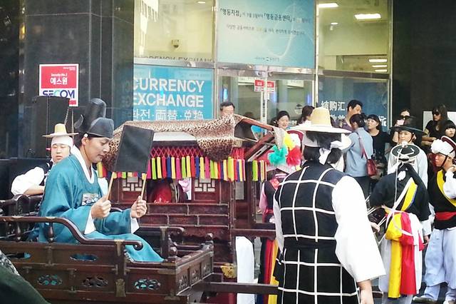 明洞的一个游行,新郎新娘。。。新郎你拿个布挡着就看不到了么。。。