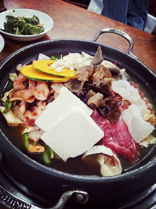 和H童鞋小逛了一下明洞后去全州中央会馆吃了个午饭。说实话,虽然网上很多推荐的,但是我觉得这家真的很贵,这个牛肉章鱼火锅要28000(我记得是),两人份,找个小店肯定便宜很多。最近在釜山料理吃了一下同名的火锅,发现釜山料理果然不能和釜山的料理相提并论。