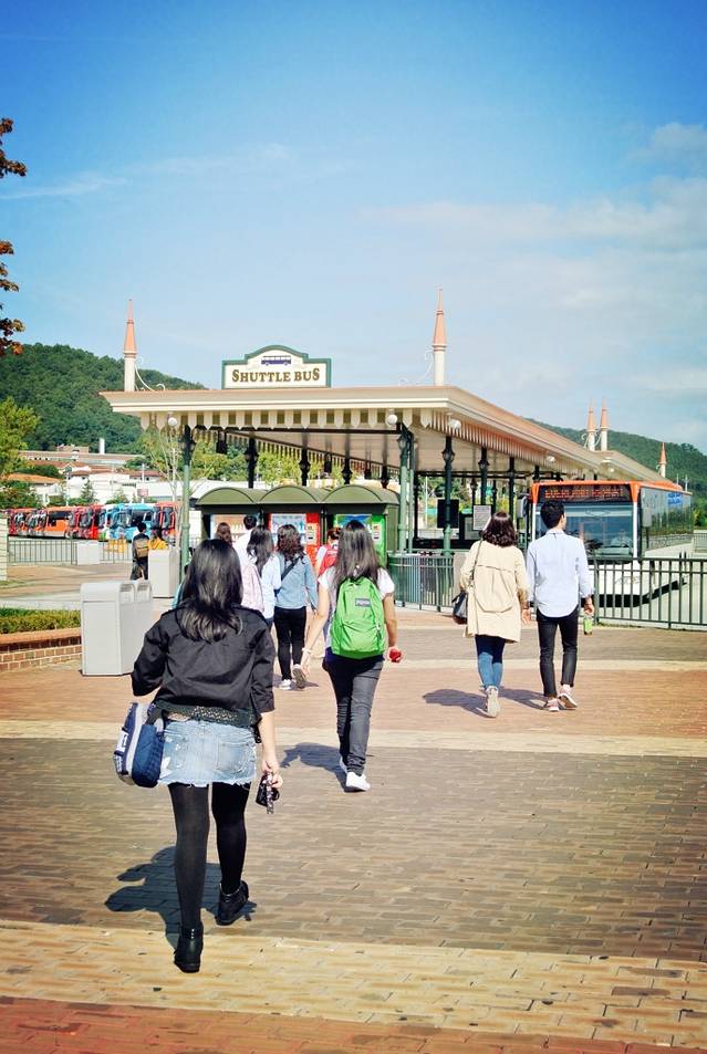 加平站很漂亮,门口有很多人等出租车,对面还有公交车站。南怡岛码头离加平地铁站不是很远,打车的话也很便宜,但是那天人太多了,所以我们还是选择坐循环巴士。循环巴士站就位于加平站外tourist center附近,1个小时才有一趟车(完全不合理,回来的时候好崩溃根本就等不到)。